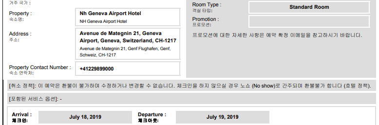 이번 여행 마지막 숙소는 공항 옆에 있는 호텔 NH(Hotel NH Geneva Airport, https://www.nh-hotels.com/hotel/nh-geneva-airport) 입니다. 제네바 출발 비행기가 오전 비행기이기 때문에 안전하게 공항 옆에 있는 숙소를 잡았습니다. 숙소에 도착하면 1인당 4 CHF의 도시세를 지불해야 한다고 합니다. 역시 스위스는 모든 게 비쌉니다. 조식 불포함 조건이므로 저녁과 아침은 준비한 것으로 해결합니다.