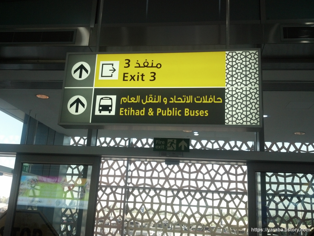 도착 홀(Arrival Hall)에 도착하면 "Etihad & Public Buses, 에티하드 및 대중교통 버스" 표지를 따라 밖으로 나가면 됩니다. 새벽 시간이라도 밖에 나가면 후텁지근하기 때문에 공항 내부에서 휴식을 취하다가 예약해둔 셔틀버스 시간에 맞추어 나가는 것이 좋습니다.