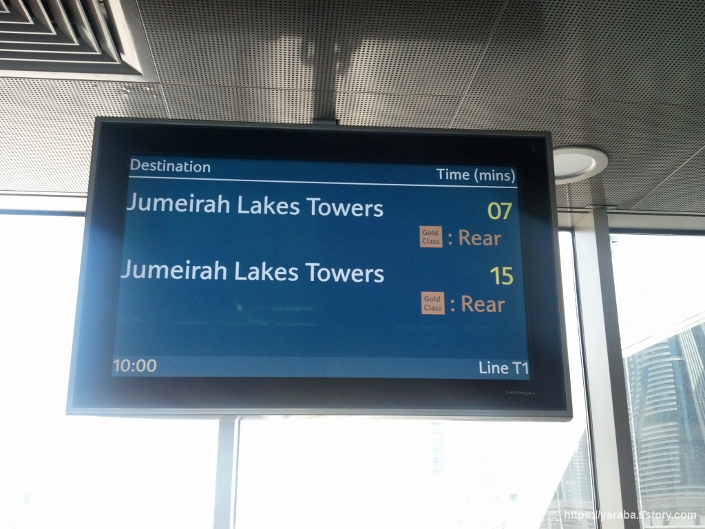 저희가 탈 트램은 "Jumeirah Lakes Towers"행으로 전광판에서는 목적지와 함께 몇분후에 트램이 도착하는지 남은 시간과 골드 클래스 객실이 어디에 있는지를 표시하고 있습니다.