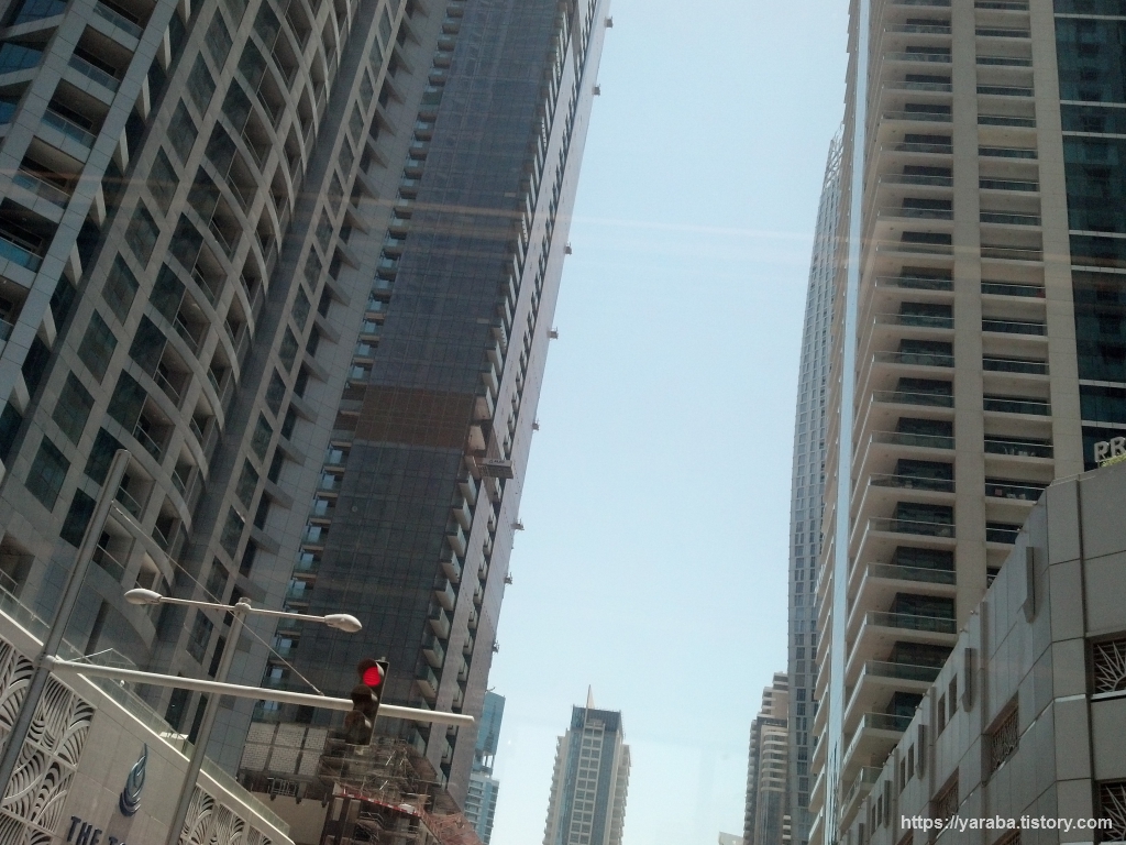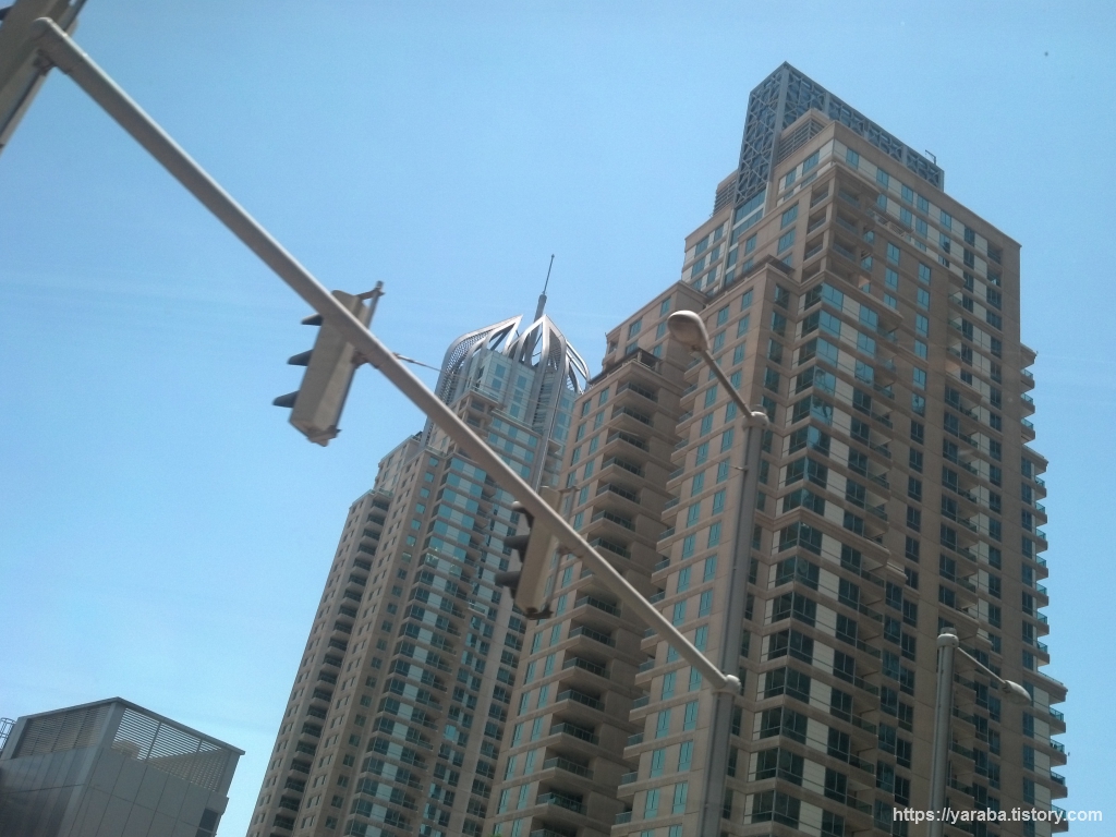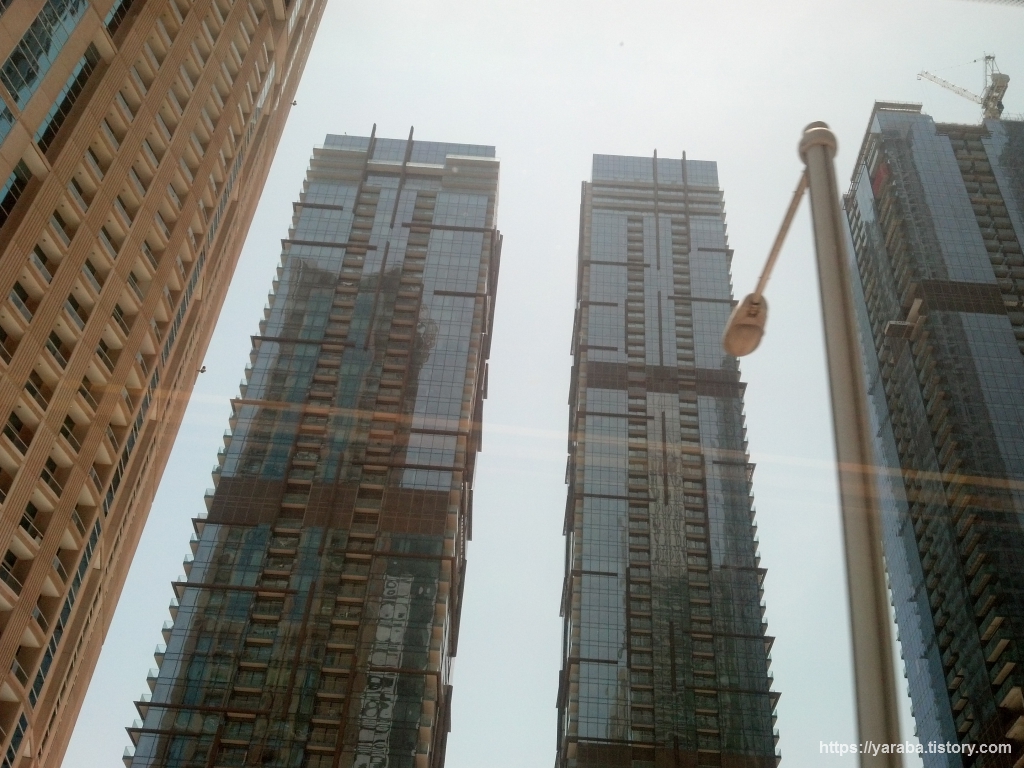 마리나 몰에서 팜 주메이라(Palm Jumeirah1)역까지 트램으로 이동하는 길은 마리나 워크(Marina Walk)를 따라 들어선 다양한 빌딩들 사이를 지나는 길로 JBR과 마리나 워크 근처의 마천루들을 감상할 수 있는 시간이었습니다. "마리나 타워스, Marina Towers"라는 트램역을 지나는데 두바이 마리나를 건설하면서 지은 6개의 주거용 빌딩군들 근처에 있는 트램역입니다. 6개의 빌딩들 중에 위의 사진에서 뒤에 있는 빌딩이 알 무르잔(Al Murjan), 앞에 있는 것이 알 매스(Al Mass) 입니다.
