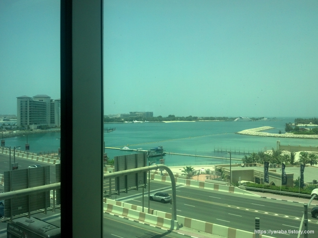 모노레일 역 플랫폼에서 바라본 주변 풍경입니다. 팜 주메이라 섬으로 가는 방법은 지금 타려는 모노레일도 있지만 핵심은 위의 사진에서 보듯이 도로망입니다. 2009년에 운행을 개시한 5.4Km의 모노레일은 중동에서는 최초로 건설될 것이라 합니다. 모노레일은 콘크리트나 철제로 된 궤도가 하나인 것으로 건설비가 적게 들고 빨리 건설할 수 있는 장점이 있으나 운송량이 작고 속도가 느린 단점이 있다고 합니다. 우리나라에서는 대구 도시 철도 3호선이 2015년부터 운행하고 있습니다.