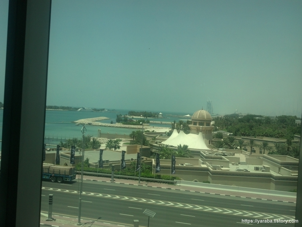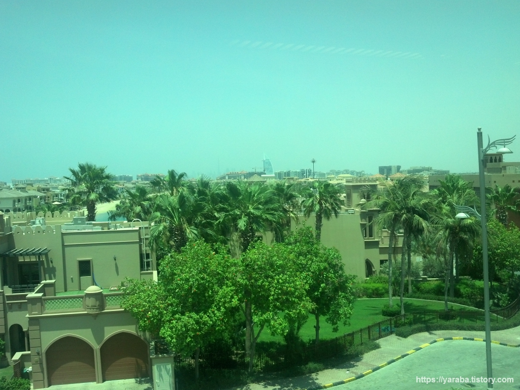 열차가 섬 끝쪽으로 이동하면서 바깥 풍경으로는 야자수 모양을 한 주 메이라 섬의 각 잎사귀에 해당하는 지역들이 보이기 시작했습니다. 각 잎사귀 중앙으로 도로가 있고 도로 양쪽으로 가옥이 배치되고 그 가옥 뒤로는 작은 모래 해변과 바다가 이어지는 형태입니다.