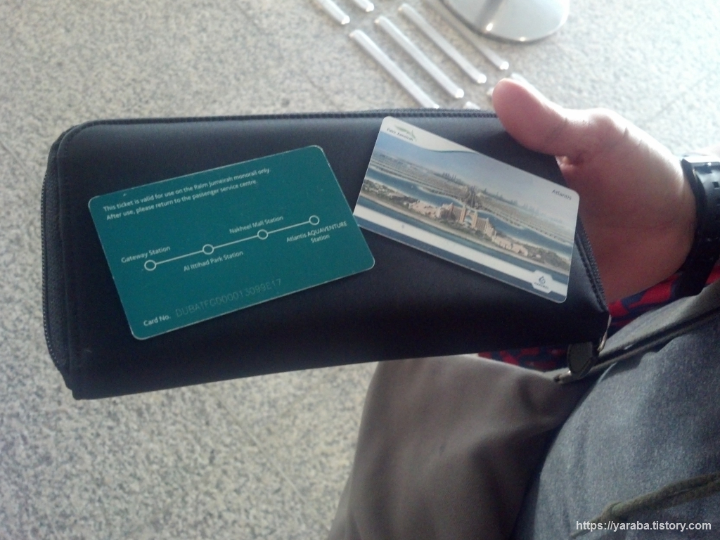 모노레일 역에 도착해서 자판기로 티켓을 구입하려 했더니 기계 자체가 잘 동작하지 않았습니다. 역무원이 자신에게 오라고 손짓을 해서 역무원에게 티켓을 구매했는데 모두들 역무원에게 표를 끊어야 되는 모양이었습니다. 메트로, 트램, 버스를 자유롭게 사용할 수 있는 1일권은 여기에서는 사용할 수 없고 1인당 30 디르함을 지불하고 왕복 티켓(return ticket)을 구매해야 합니다. 위의 티켓에서 보듯이 정거장은 고작 4개인 것에 비하면 비싼 편이지요. 주의할 점은 팜 아틀란티스 역에서 내릴 때 대부분의 승객은 편도로 가기 때문에 표를 반납하는데 저희처럼 당일 왕복으로 표를 끊은 사람들은 "리턴 티켓"이라 말하면서 표를 반납하지 말아야 합니다. 그래야 돌아갈 수 있습니다.