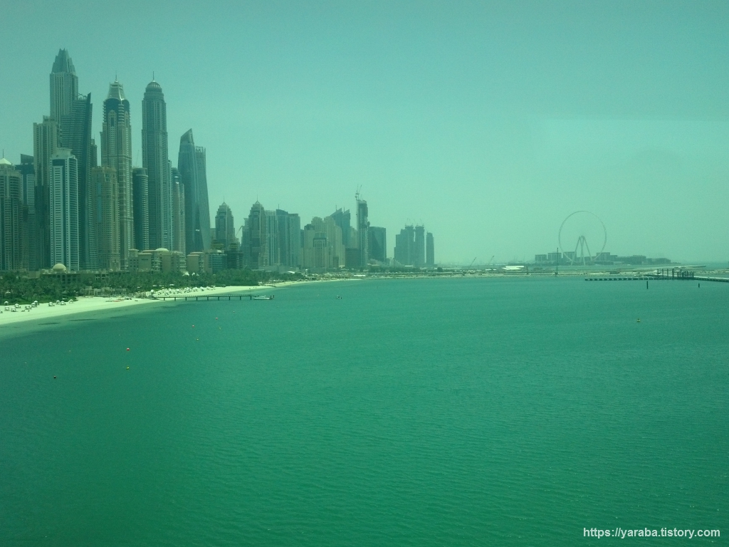 드디어 모노레일이 움직이기 시작했습니다. 열차가 출발하자마자 창밖으로 막힘없는 뷰가 펼쳐지면서 승객들은 모두 창가로 달려가 풍경 감상에 빠집니다. 대부분 중국인 단체 관광객들인 모양이었습니다. 조금 전에 다녀온 JBR 비치와 이후로 이어지는 5성급 호텔들의 전용 비치 풍경이 한 폭의 그림입니다.