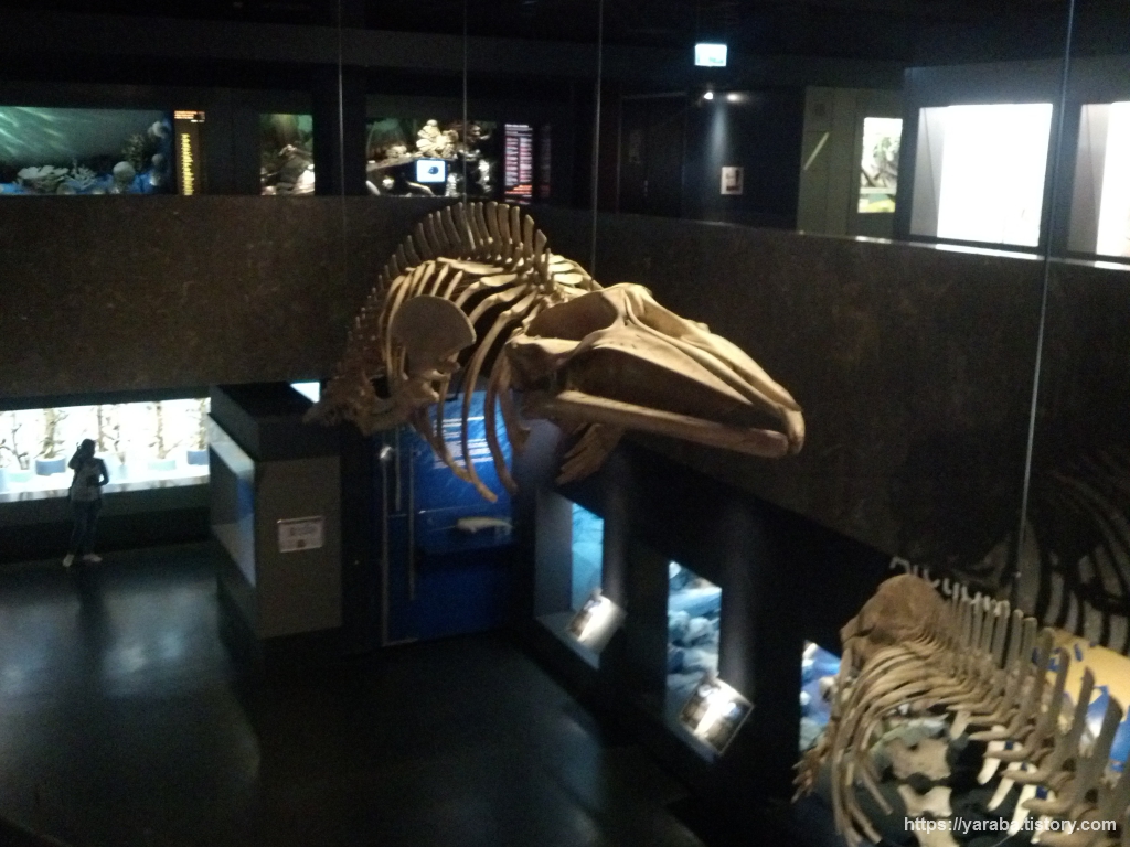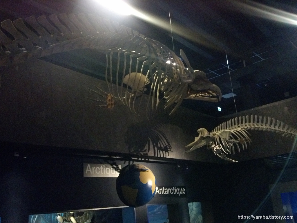중앙 홀 상단에 매달린 고래뼈. 하나는 범고래의 뼈로 보입니다. 남극과 북극을 비롯해서 전 세계의 바다에서 서식하는데 남극과 북극에서만 서식하는 종이 있고 회유하는 종이 있는데 회유하는 종도 여름철에는 남극과 북극 주변에 먹이가 풍부해져서 이곳에서 먹이 활동을 한다고 합니다. 처음에는 수장룡이나 어룡 같은 물에서 사는 공룡이 아닌가 하는 착각을 했습니다. 그런데 이 박물관에서는 공룡을 다루지 않으니 공룡은 아닌 것이죠.