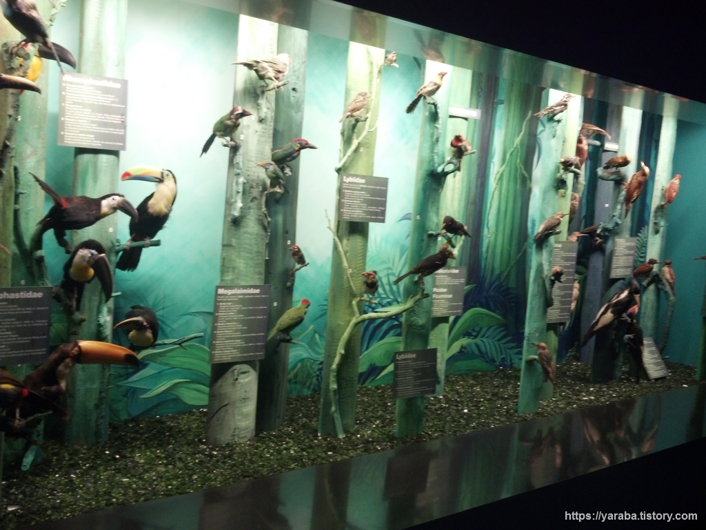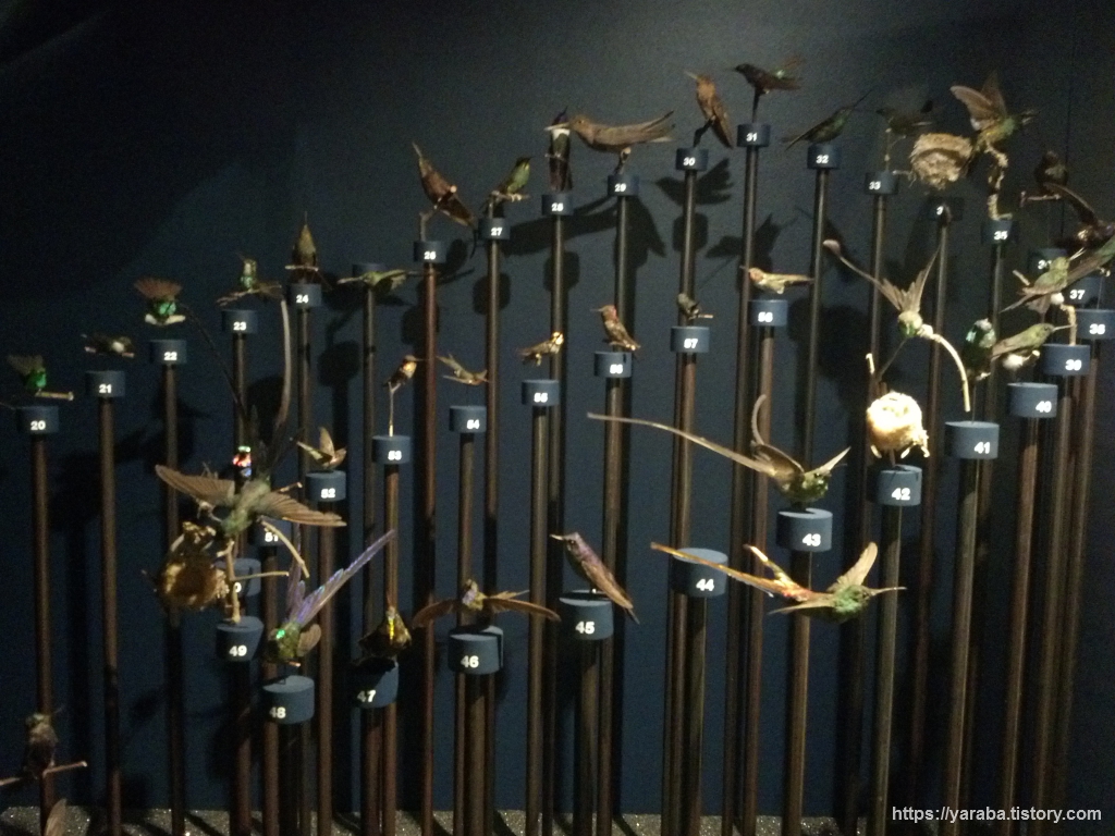 새에 대한 설명으로 넘어 오니 동물 박제의 효과가 더욱 확실합니다. 포유류나 조류의 박제를 주로 하는데 동물이 죽으면 가죽만 남기고 내부는 모두 걷어낸 다음 가죽에 방부처리를 하고 내부는 우레탄이나 스티로폼으로 채우는 방식입니다. 박제 제작이 어려운 동물은 포르말린 용액에 넣어서 표본으로 만드다고 합니다.