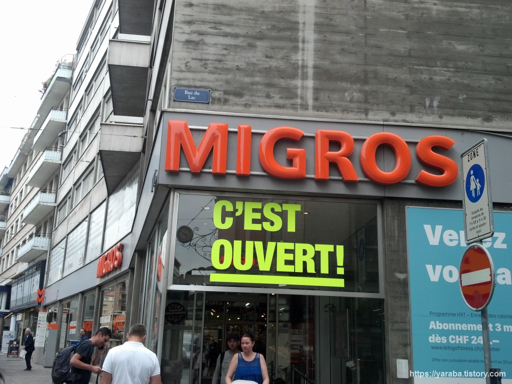 호수로(Rue de Lac)에 위치한 미그로스(MIGROS) 슈퍼에서 점심용 샌드위치용 음료수 등을 구매해서 박물관으로 향합니다. 저희는 환전한 스위스 프랑으로 결제했지만 스위스의 슈퍼나 편의점에서는 유로를 받기도 합니다. 경우에 따라서는 유로화는 지폐만 받고 잔돈은 스위스 프랑으로 주는 방식을 적용하기도 합니다. "C'EST OUVERT, 열려 있습니다!"라는 문구를 붙이고 있는 이 슈퍼마켓은 스위스에서 독보적인 점유율로 슈퍼를 운영하고 있는데 재벌의 소유가 아니라 협동조합 이랍니다. 인구의 거의 30%에 육박하는 사람들이 가입하고 있는 조합이니 이곳의 주인은 국민이라 해도 과언이 아니겠습니다.