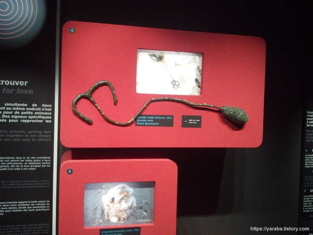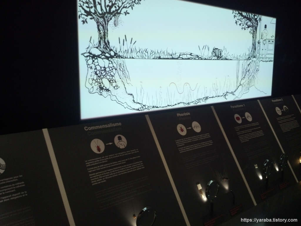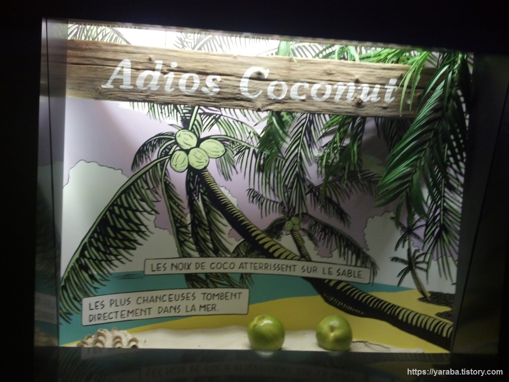 위의 그림에서 좌측은 코코넛의 전파 과정을 만화 형태로 설명하고 있는 것이고 우측은 연못과 같은 작은 생태계에서 나는 다양한 소리를 위치별 버튼을 이용해서 직접 들어 볼 수 있는 부스입니다. 코코넛 열매는 그 자체로 부력이 있고 방수가 되기 때문에 바다 위를 떠다니다가 육지에 닿으면 그곳에서 뿌리를 내려 번식하는 특이한 번식 방법을 가지고 있습니다. 과학자들이 코코넛의 유전자를 조사한 바로는 코코넛은 크게 키가 작고 달콤한 태평양 코코넛과 키가 커서 야자유나 섬유로 주로 이용하는 인도양 코코넛이 있는데 태평양 코코넛은 고대인에 의해 동남아시아와 동아프리카로 전파되었고 인도양 코코넛은 유럽 열강의 정복자들의 의해 서아프리카와 북미, 남미 대륙으로 전파되었다 합니다. 코코넛을 가지고 다니다 우연히 번식했거나 사람이 직접 심은 인위적인 전파도 있었다는 것입니다. 코코넛 전파 경로가 관련한 인류의 이동 역사나 신대륙 정복 과정과 일맥상통하는 점이 있다는 것입니다.