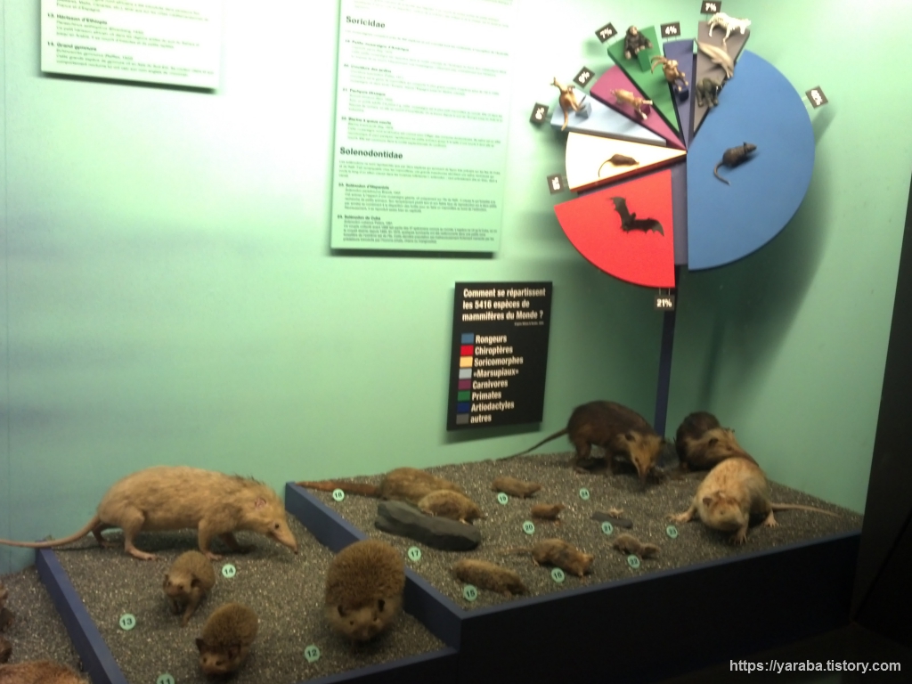 포유류 중에 번성한 정도를 차트로 보여 주고 있는 곳입니다. 가장 번성한 것은 역시 설치류이고 그다음이 27% 정도인 박쥐라는 것이 인상적입니다. 박쥐는 1년에 한 번 새끼를 낳는데 새끼를 품에 안고 다녀서 생존율이 높다고 합니다.