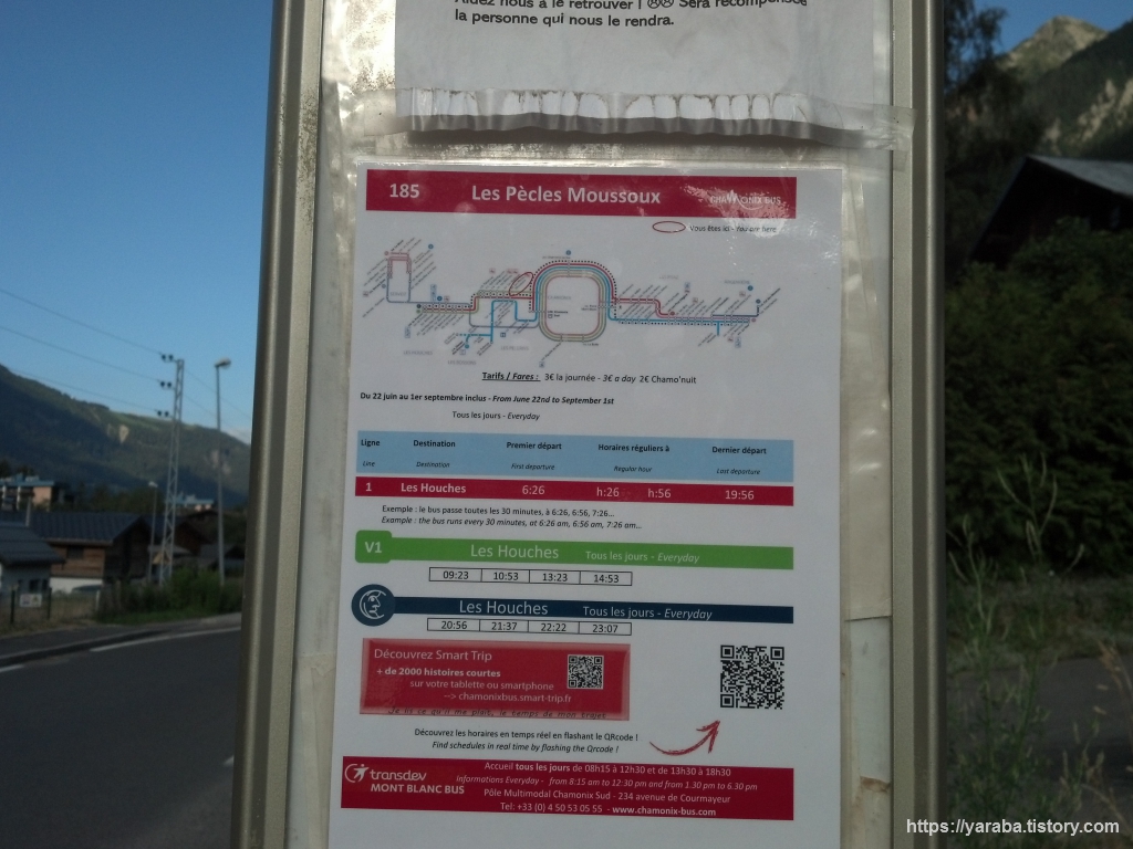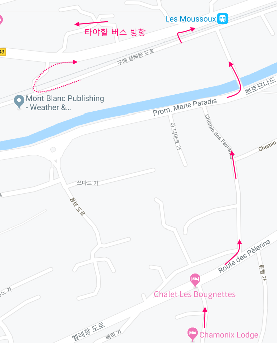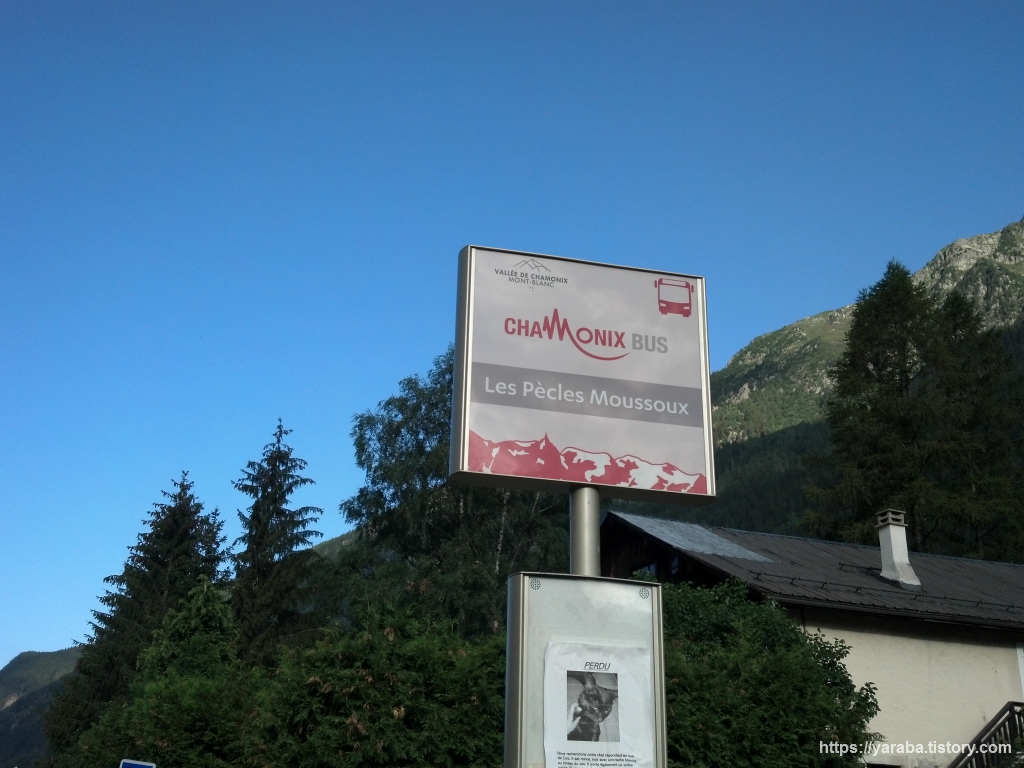 "레 뻬끌레 무슈, Les Pècles Moussoux" 버스 정류장입니다. 이곳에서 레 우슈 방면의 1번 라인 샤모니 버스에 승차하면 됩니다.