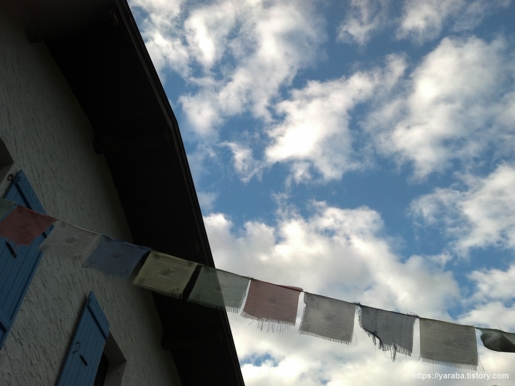 어제와는 달리 구름이 조금 있지만 맑은 하늘에 화창한 날씨입니다. 주인장이 히말라야에 다녀왔는지 5색 깃발을 걸어 놓았습니다. 티베트, 인도, 네팔 등에서 걸어 놓는 룽타(風馬)라는 것인데 것인데 불교가 세상에 전파되기를 염원하는 것이라 합니다.