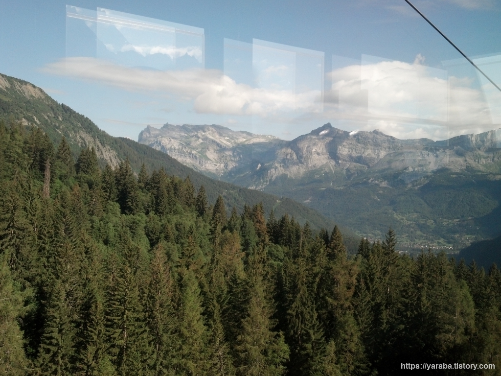 울창한 침엽수림과 깎아지른 바위산들을 구경하다 보니 케이블카는 어느덧 벨르뷰(Bellevue)에 도착했습니다.