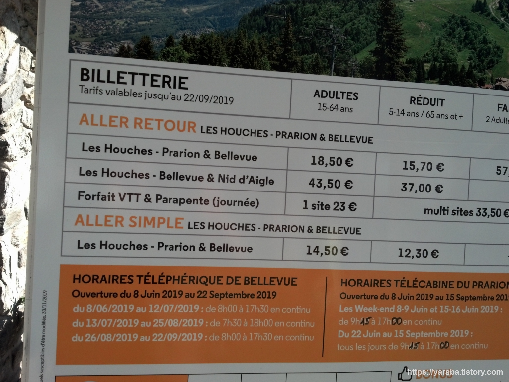 약 1,800미터에 이르는 벨르뷰(Bellevue)까지의 편도 티켓을 먼저 끊었습니다. 케이블카는(https://www.chamonix.com/bellevue-cablecar,231,en.html 참조) 06/29~08/24 기간에는 07:30~18:00까지 운행하고 편도 티켓은 1인당 14.5유로입니다. 많은 분들이 이곳을 통해서 TMB 걷기를 시작하시더군요.