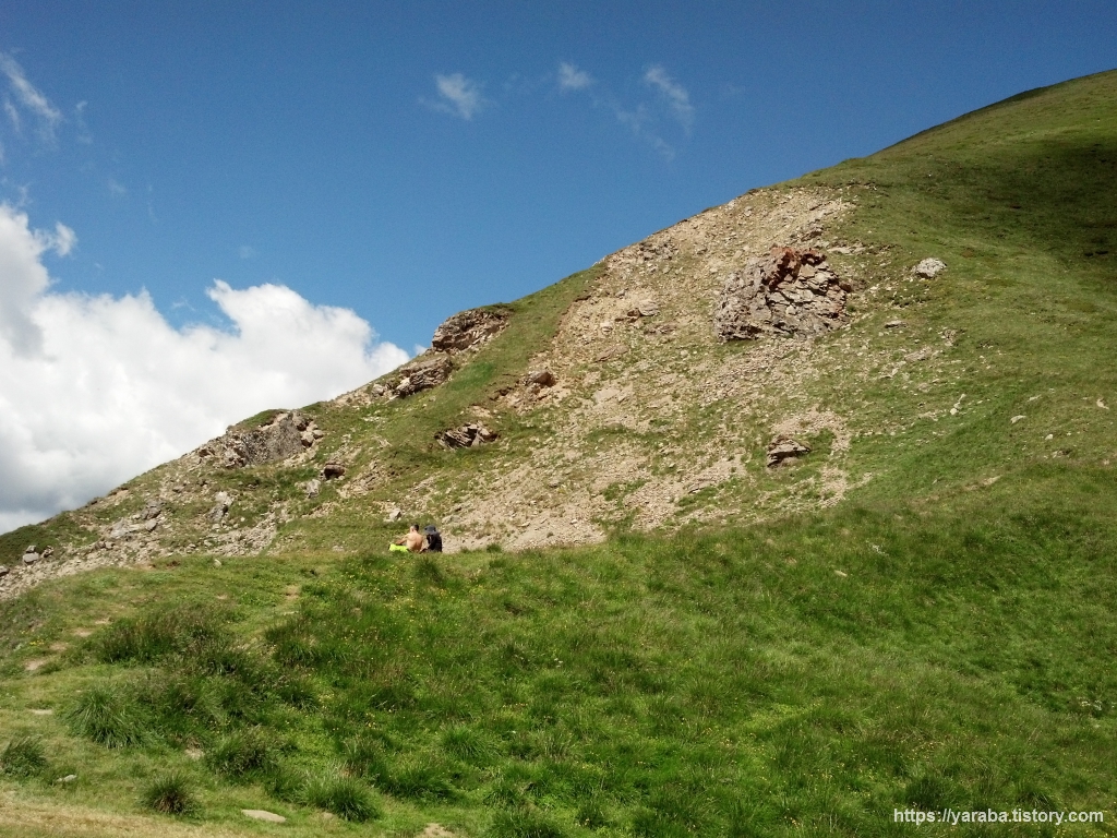 휴식이 끝나면 내려갈 고갯길입니다. 누군가는 힘들게 올라올 길이지만 다른 누군가는 콧노래를 부르며 내려갈 길입니다. 산 아래에는 미아주 산장도 보입니다.