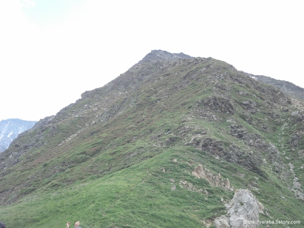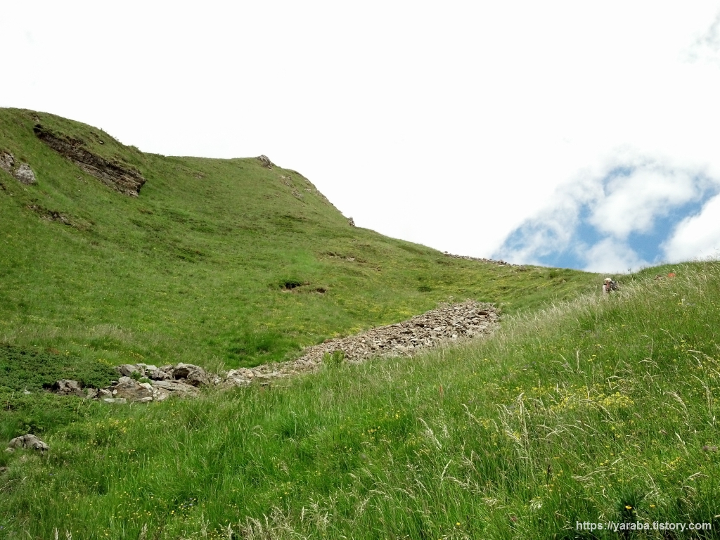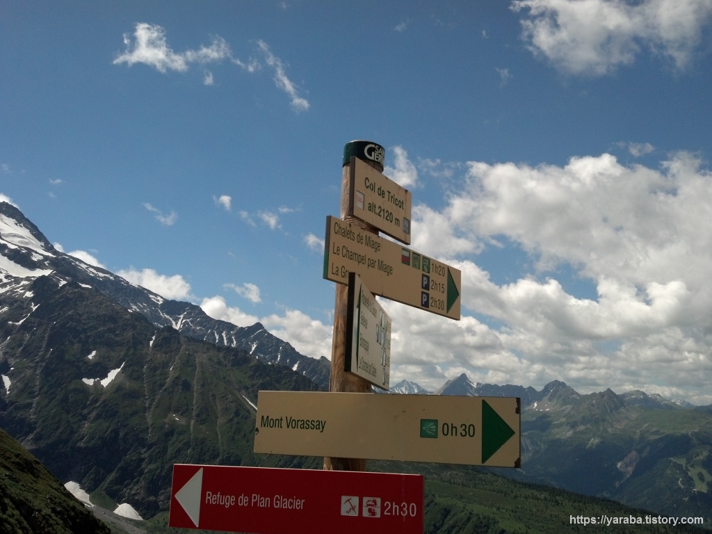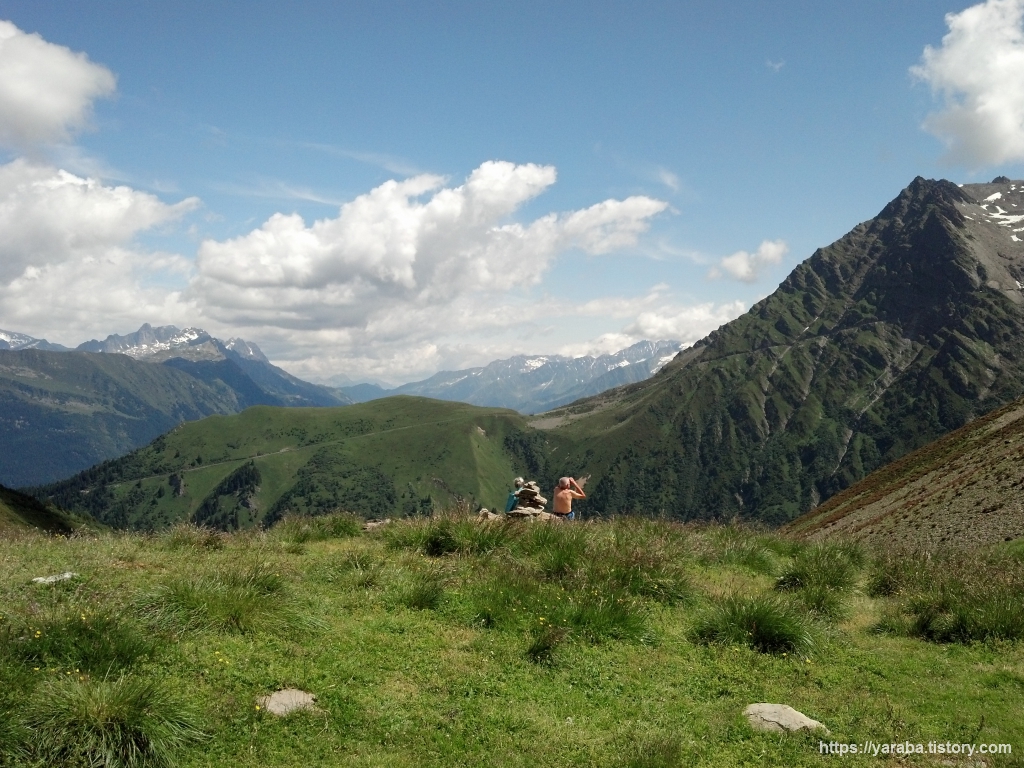 트리코 고개 우측으로 높다랗게 서있는 것은 보라세이 봉(Mont Vorassay, 2,299 m)입니다. 봉우리까지는 TMB 경로는 아니지만 등산로가 있습니다. 보라세이 봉까지 아찔해 보이는 등산로인데 모레면 비슷하거나 더 심한 곳을 걸으리라고는 이때까지는 상상도 못 하는 상황이었죠.