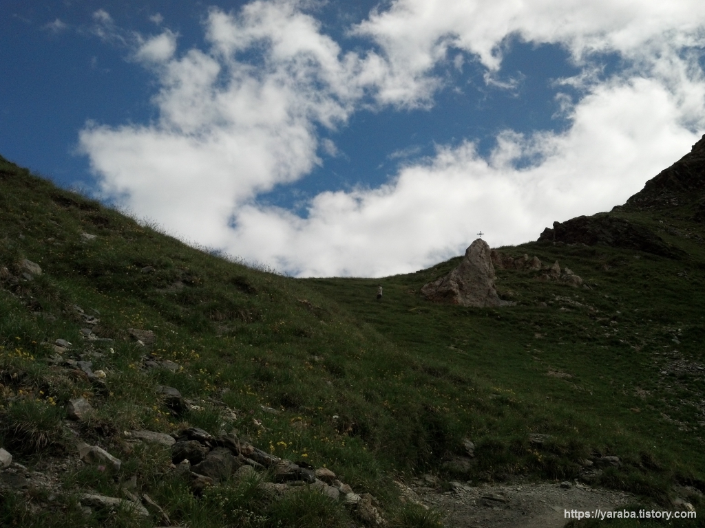 휴식을 끝내고 미아주 산장 방향으로 내려가는 길, 멀리 바위 위에 세워진 십자가가 작별 인사를 합니다.