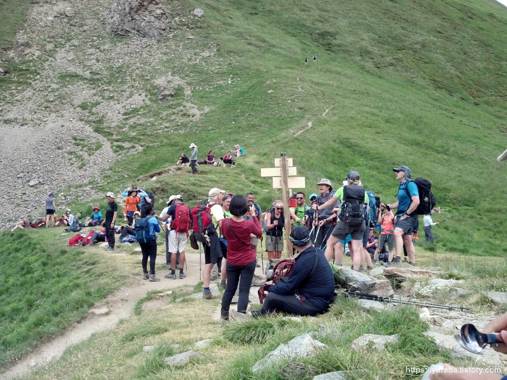 TMB(뚜르 드 몽블랑) 걷기는 "고개 넘기"라 해도 과언이 아닐 정도로 큰 고개 하나를 넘으면 하루의 여정이 끝나는 것이 보통입니다. 그리고 프랑스와 이탈리아, 이탈리아와 스위스, 스위스와 프랑스가 만나는 국경도 모두 고개입니다. 고개를 오를 때는 턱까지 차오르는 숨을 달래며 자신과의 싸움을 묵묵히 감당해야 하지만 일단, 고갯마루에 올라 서면 탁 트인 전경과 함께 해냈다는 쾌감을 즐길 수 있습니다. 이번 TMB 걷기에서 처음으로 만난 고개인 트리코 고개(Col de Tricot, 2,120m)에서 가진 휴식은 정말 꿀맛과 같이 달콤했습니다.