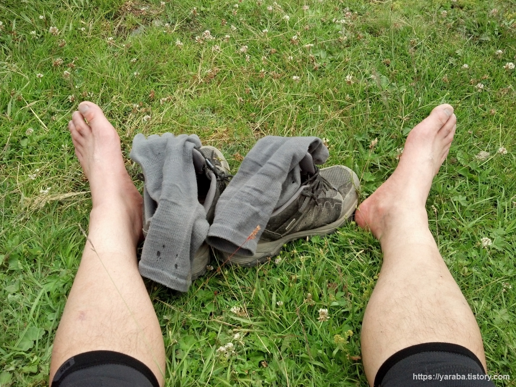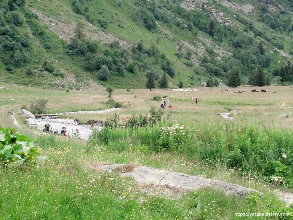 산장에서 볼일을 해결하고 주위를 둘러보니 멀리 방목하는 소들도 있었지만 계곡물 주위로는 사람들이 여유롭게 휴식을 취하고 있었습니다. 저희도 몸의 열기도 식힐 겸 개울물에 발을 담그기로 했습니다.