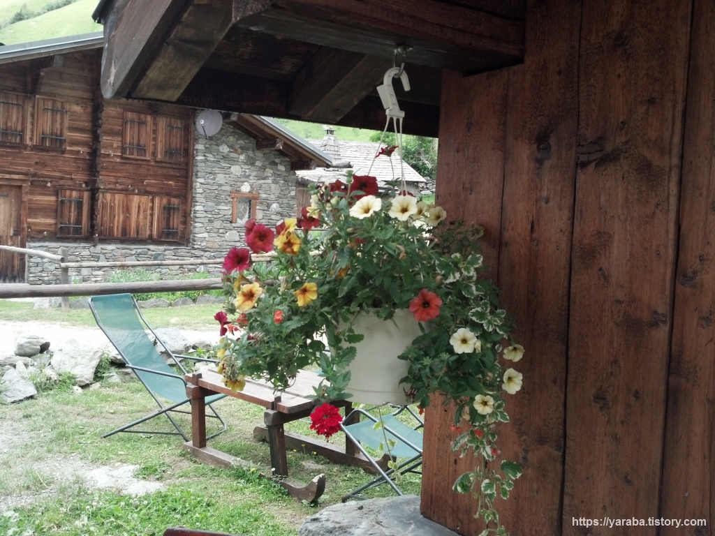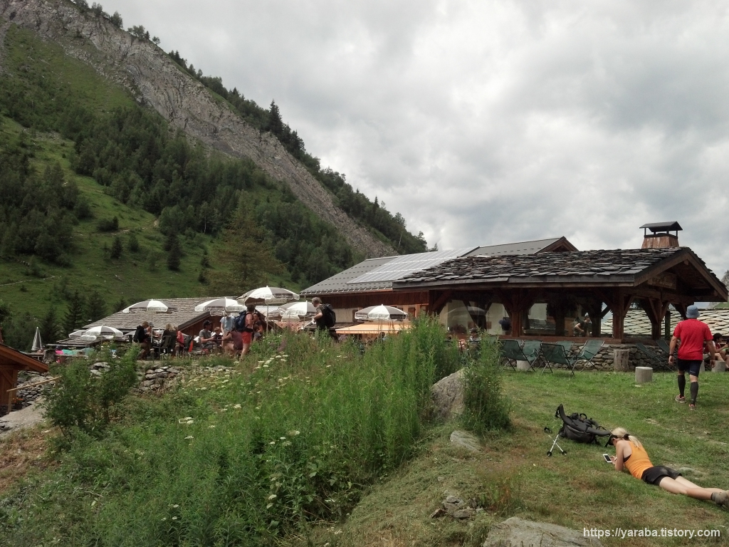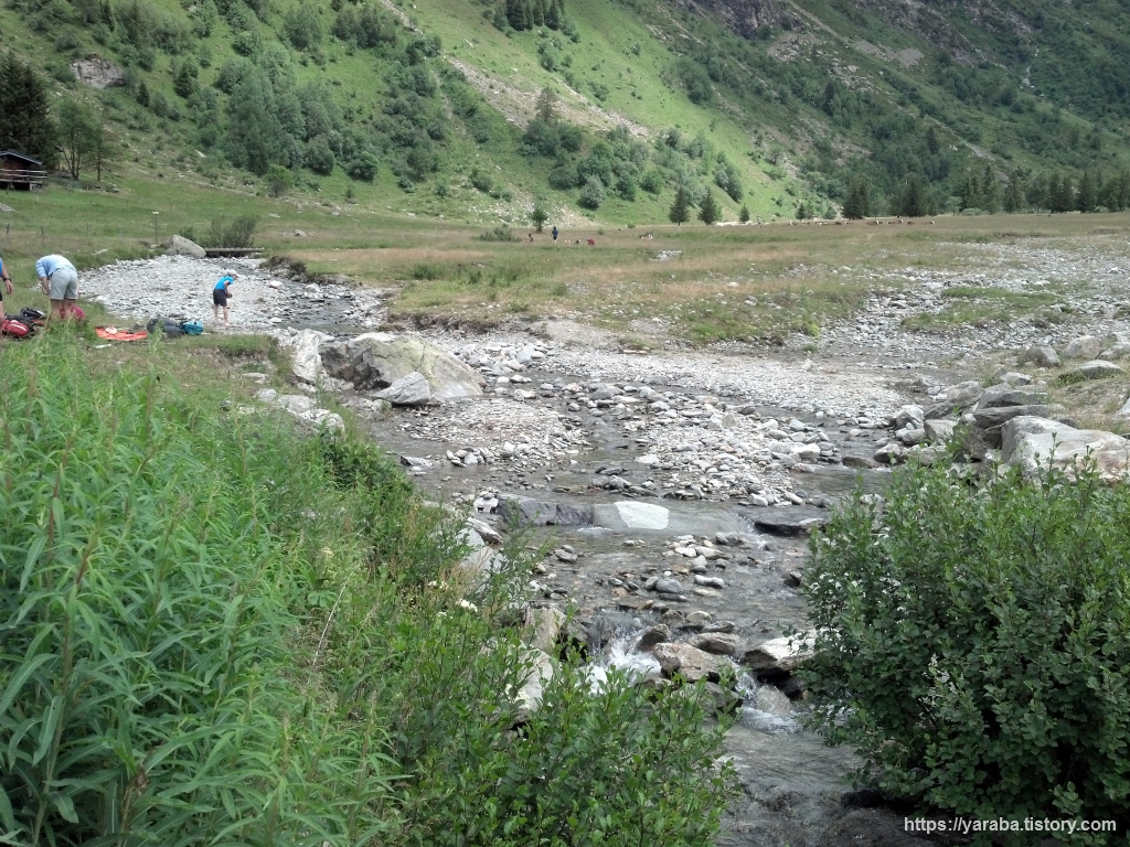 바로 옆으로 계곡물이 흐르는 미아주 산장(Chalets de Miage, 1,559m)입니다. 산장 분위기는 여유로움 그 자체입니다.