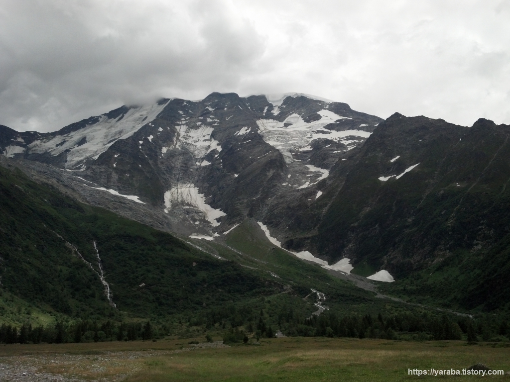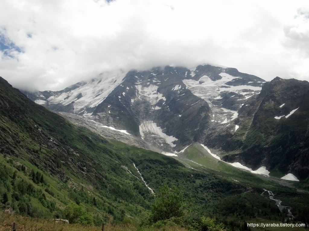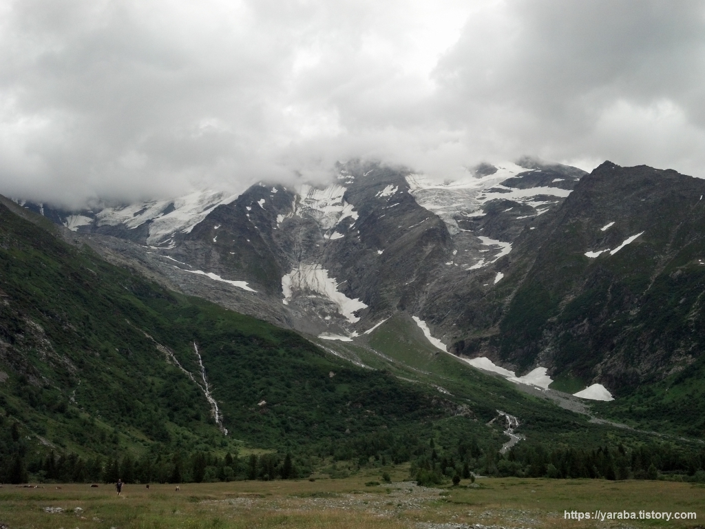 구름에 가려진 미아주 봉우리(Dome de Miage, 3,673m)가 서슬 퍼렇게 위압감을 내뿜습니다.