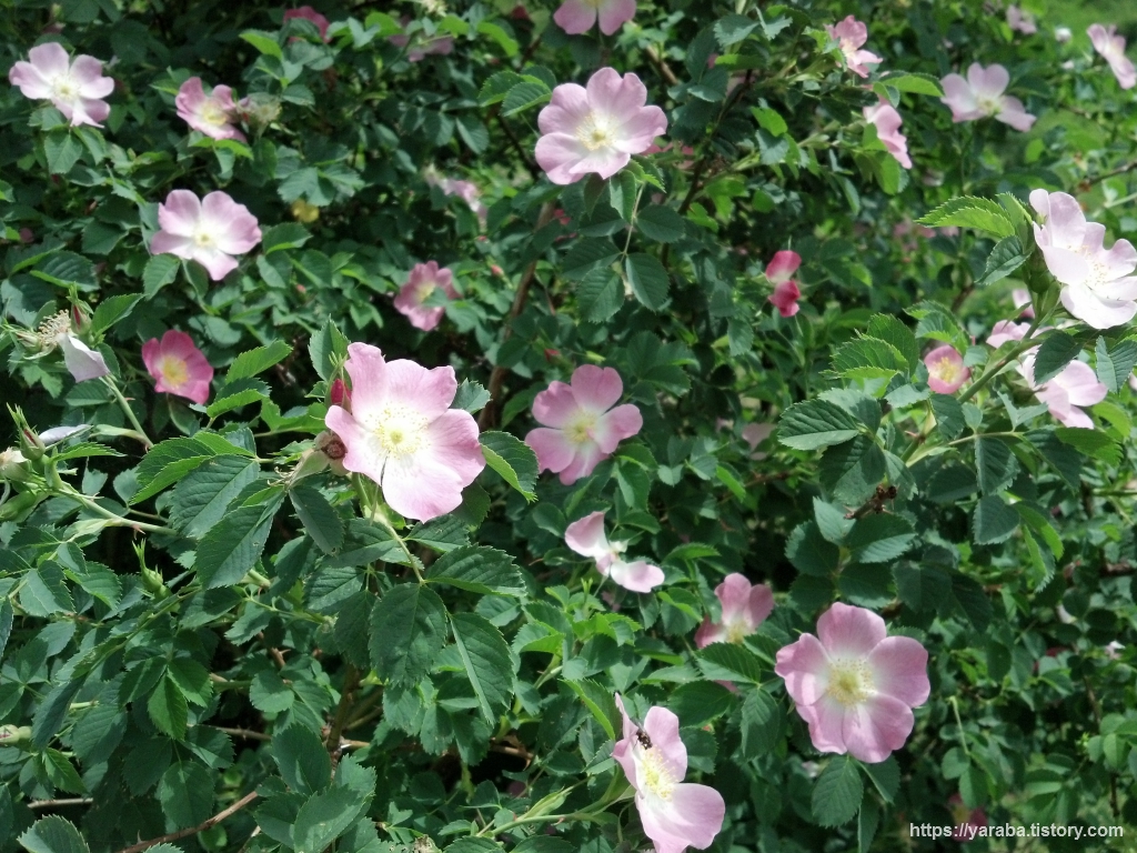 경사진 산을 거의 다 내려와 마을 근처에 이르니 지리산 둘레길을 걸을 때 만난 찔레꽃과 비슷한 꽃을 만났습니다. 보랏빛이 도는 이 꽃은 진한 향기를 가진 하얀 찔레꽃과 유사한 품종이기는 하지만 이름이 "개장미, Dog Rose(Rosa canina)"입니다.