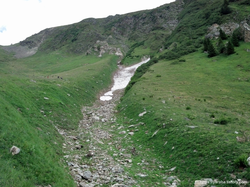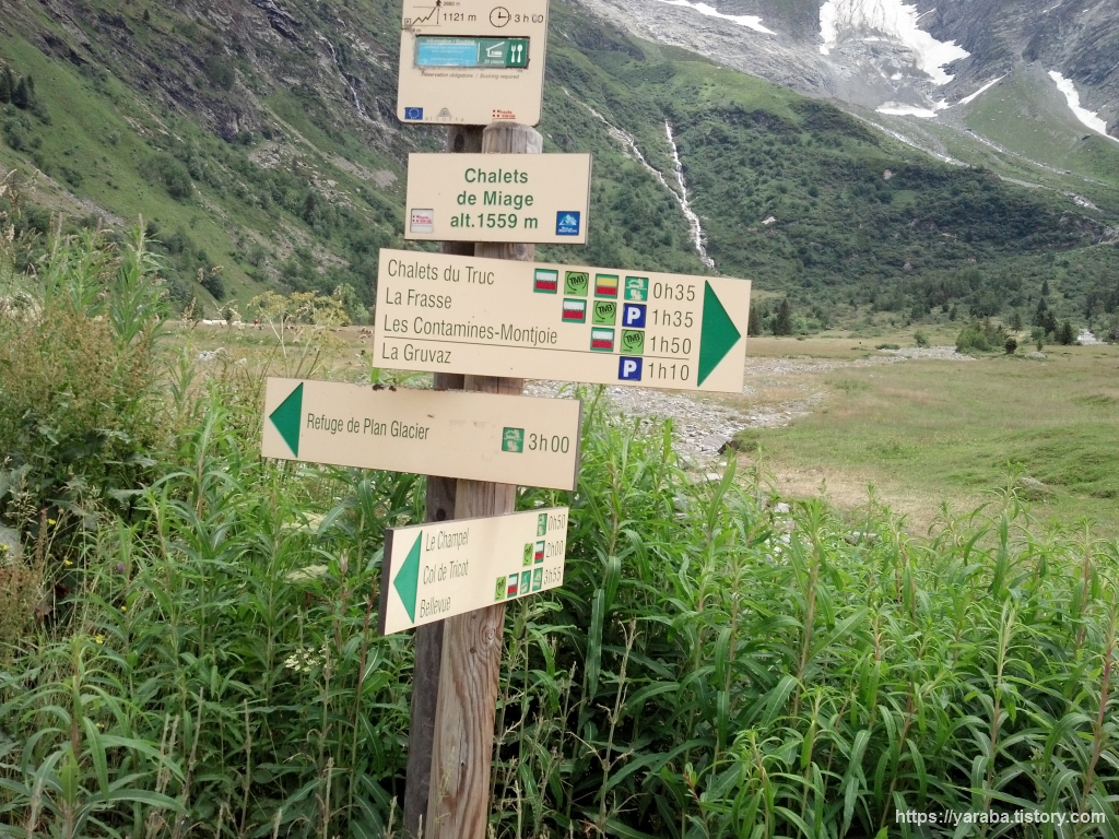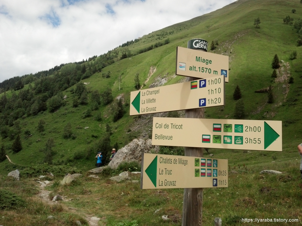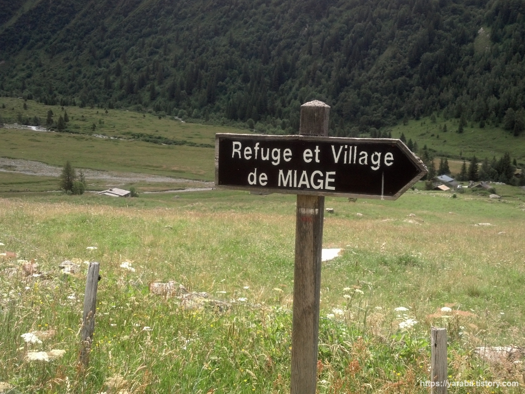 드디어 미아주(Miage, 1,570m)에 도착했습니다. 트리코 고개까지 두시간이라는데 내리막이니 부담없이 내려왔지, 이 길을 거꾸로 올라가는 것이었다면 거의 죽음이었겠다 싶습니다.