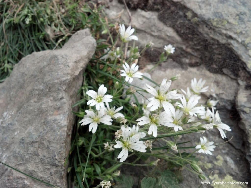 마음에 여유가 넘치니 자연스레 눈에는 더 많은 알프스의 야생화가 들어 옵니다. 점나도나물(Cerastium)이라는 특이한 이름을 가진 식물의 한 종류입니다. 꽃잎이 두 갈래로 갈라져 쥐의 귀를 닮았다 해서 영어로 "alpine mouse-ear"라고도 합니다. 이쁜 꽃입니다.