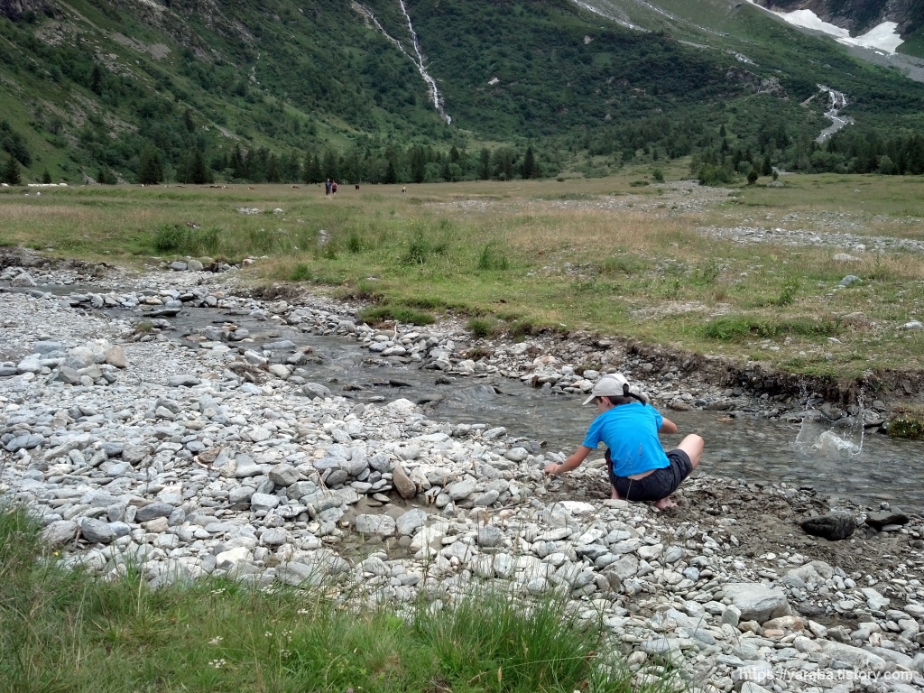 가족과 함께 온 아이가 개울에 돌 던지기 놀이를 하는 모습을 지켜보며 멀리서 들려오는 소들의 워낭소리, 계곡 물소리를 들으며 병풍처럼 서 있는 알프스를 감상하는 이 시간은 신선 부럽지 않습니다.