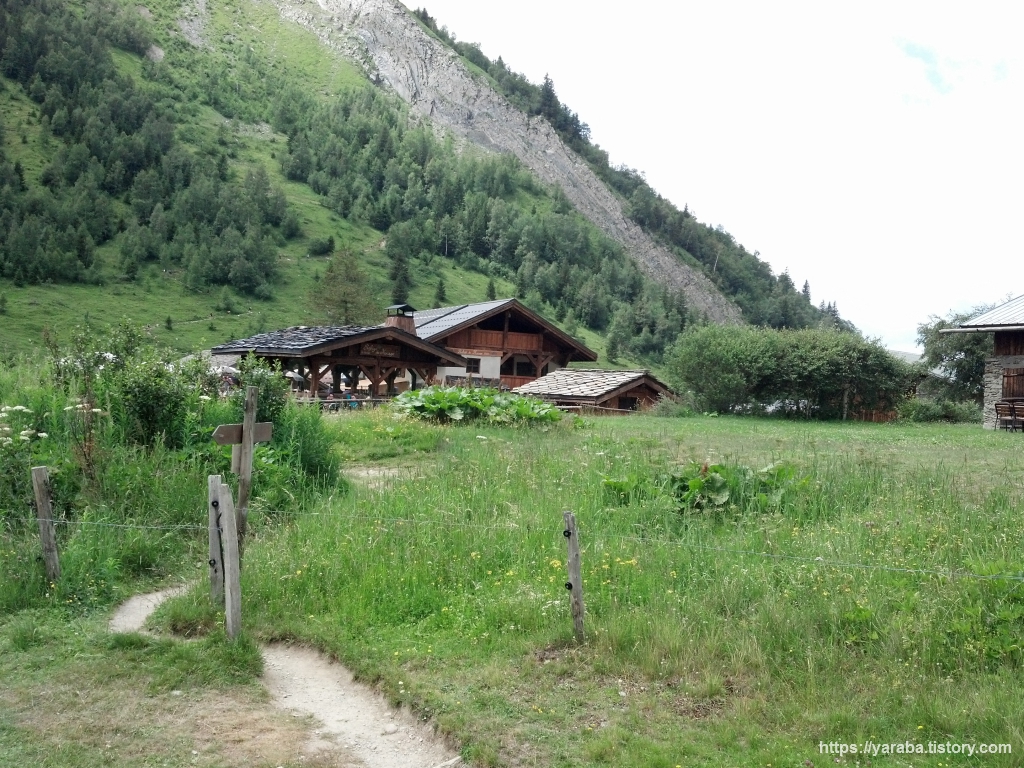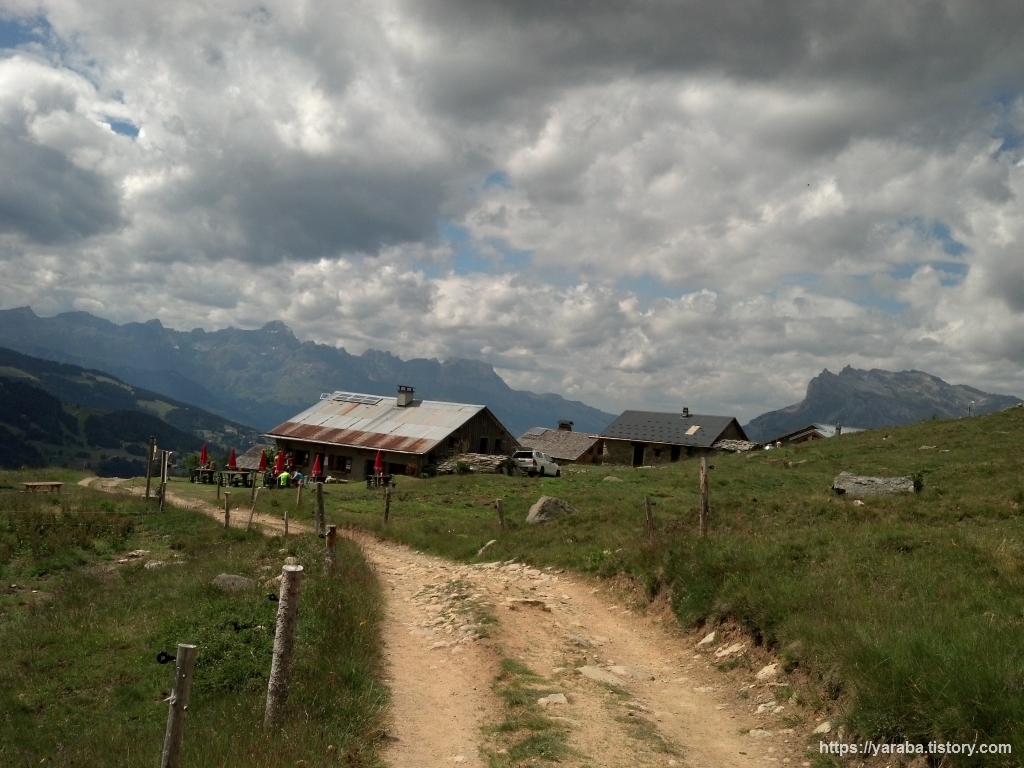 트휙 산장(Auberge du Truc, 1750m)의 모습입니다. 앞에 보이는 건물이 식당이고 숙소는 바로 옆으로 별도 건물에 있습니다. 내일의 경로는 레 꽁따민느(Les Contamines) 시내를 통과하는 코스입니다.