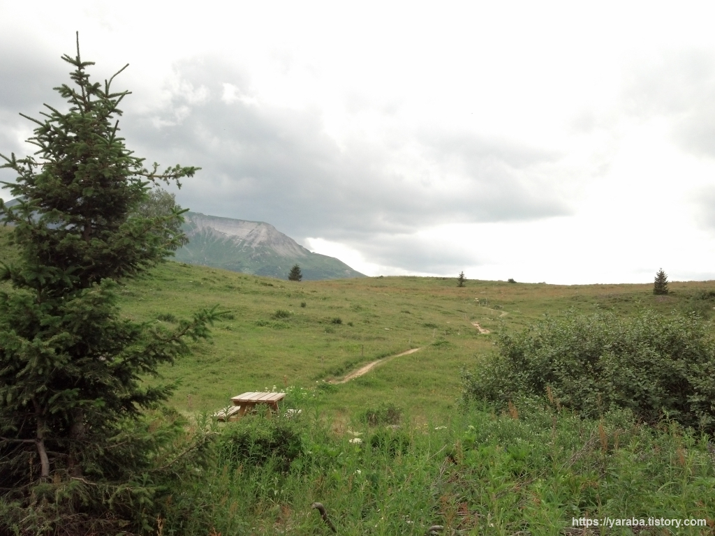 트휙 산장 근처에서 만난 야외테이블이 영화 속 한 장면을 연출하는 듯합니다. 한 동안 부드러운 언덕길이 이어지는데 이런 언덕도 산이니 봉우리가 있을 텐데 트휙봉(Mont Truc, 1,811m)이 TMB경로는 아니지만 15분 거리라 합니다. 주위의 산들을 조망하기 좋다고 합니다.