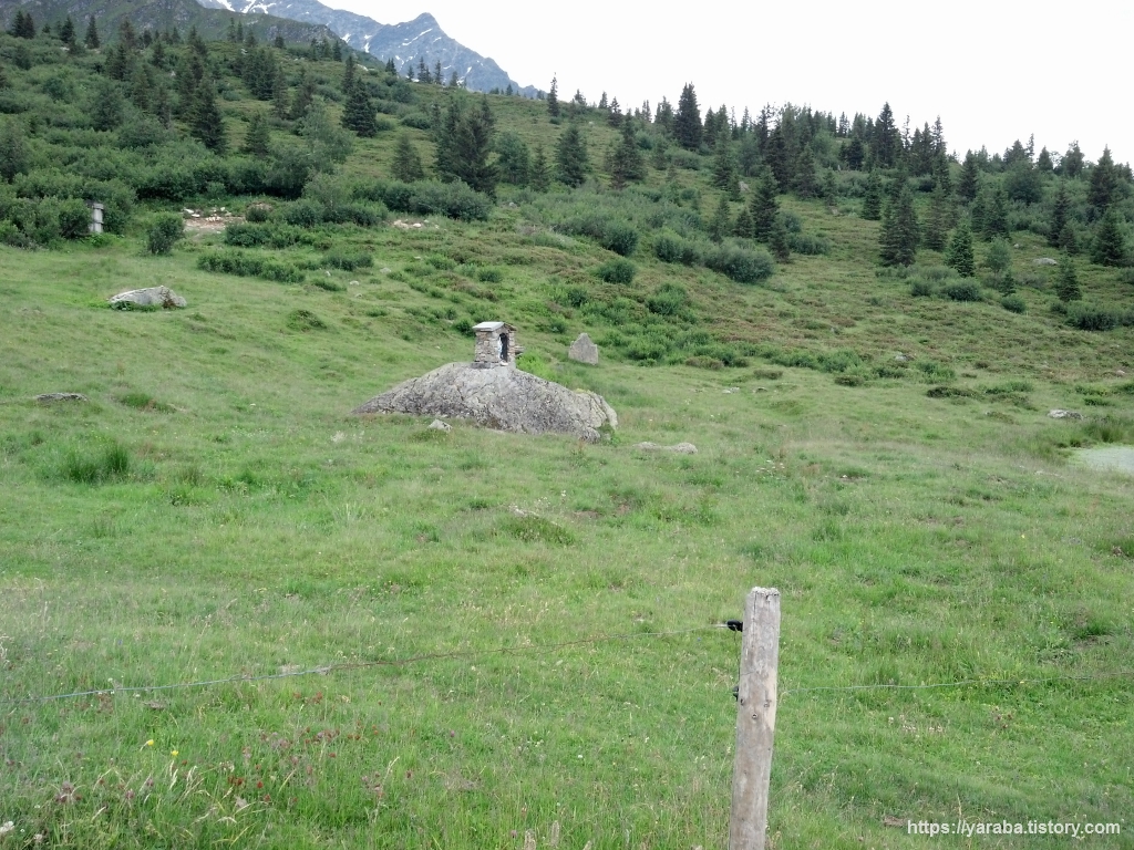 트휙 산장 근처로는 작은 기도처와 연못도 있었습니다. 지나가며 이곳은 연못도 있고 물 걱정은 없겠다! 했는데, 사실 TMB 경로의 대부분의 산장들은 물이 있는 곳에 위치해 있기 때문에 샤워가 어려운 곳은 많지만 식수는 문제가 없습니다. 저희가 초반에 얼마 되지는 않지만 불필요한 물 운반으로 체력 낭비를 초래한 오류가 있었습니다.