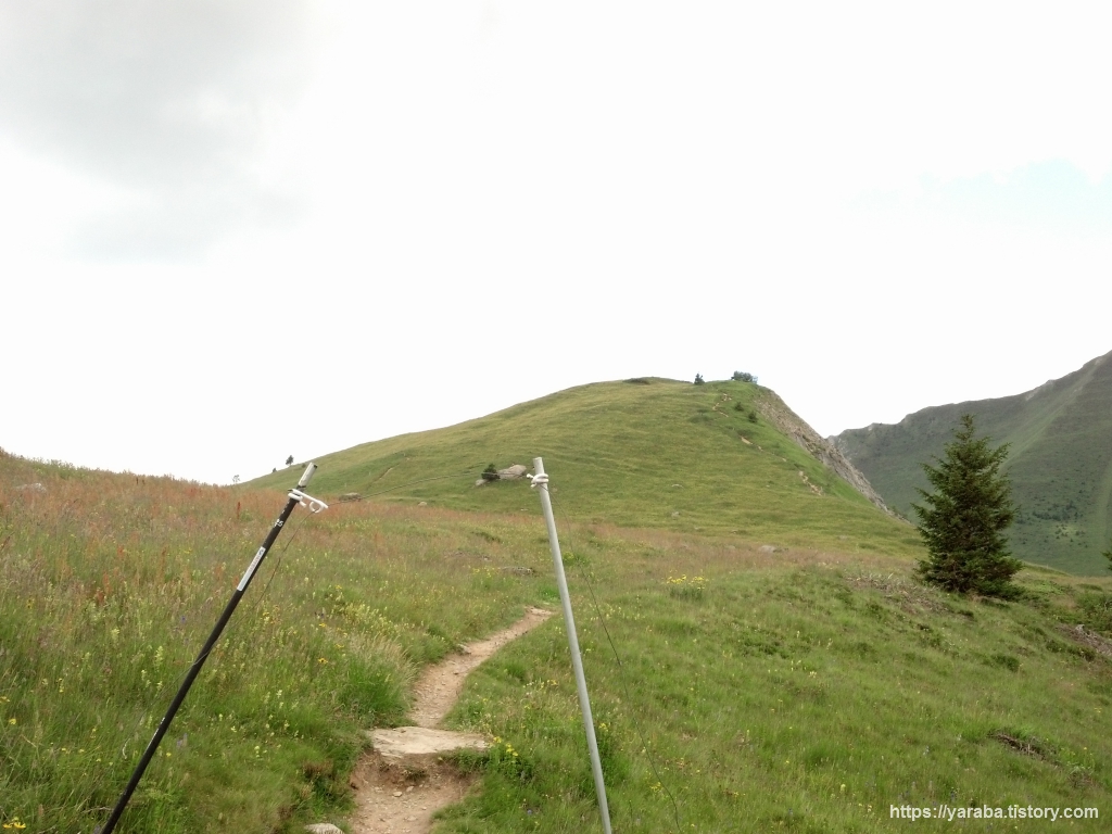 산장이 바로 옆인지 소 울타리가 길을 가로지르는데 사람들이 많이 다니다 보니 지나가라고 울타리를 올려놓았네요. "동 동 동대문을 열어라~"하는 동요가 떠오르는 풍경입니다.
