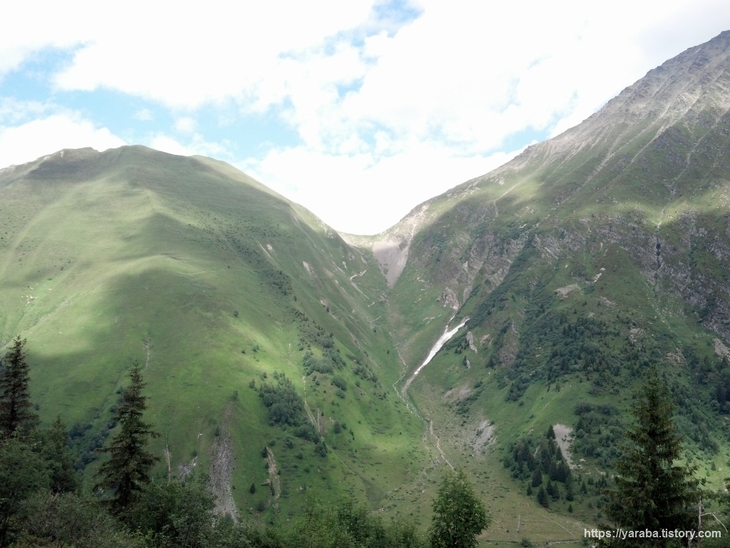 미아주 산장 옆 빙하수가 흐르는 개울가에서 발을 담그며 신선처럼 휴식을 취한 저희는 미아주 산장을 뒤로하고 오늘의 목적지인 트휙 산장으로 향합니다. 산장 옆으로 흘러 내려가는 빙하수는 생기가 넘치고 밋밋한 푸른 언덕을 배경으로 한 산장의 모습은 고즈넉합니다.