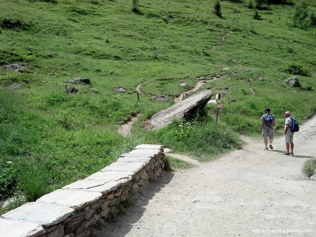 산장 입구 표지판 앞에서 갈 길을 확인하고 있는 사람들의 가벼운 차림의 모습입니다. 가벼운 차림은 두 가지의 경우가 있는데 하나는 근처에서 TMB 경로를 따라 시계 방향 또는 반시계 방향으로 일주하지 않고 당일 코스로 다녀가는 사람들인 경우입니다. 다른 한 경우는 TMB 일주는 하지만 저희처럼 무식하게 무거운 배낭을 메고 다니는 것이 아니라 숙소 간의 짐 운반 서비스를 이용하는 경우로 물이나 간식처럼 걷기에 꼭 필요한 것만 가볍게 들고 다닙니다. 저분들은 길을 따라 내려가더군요.