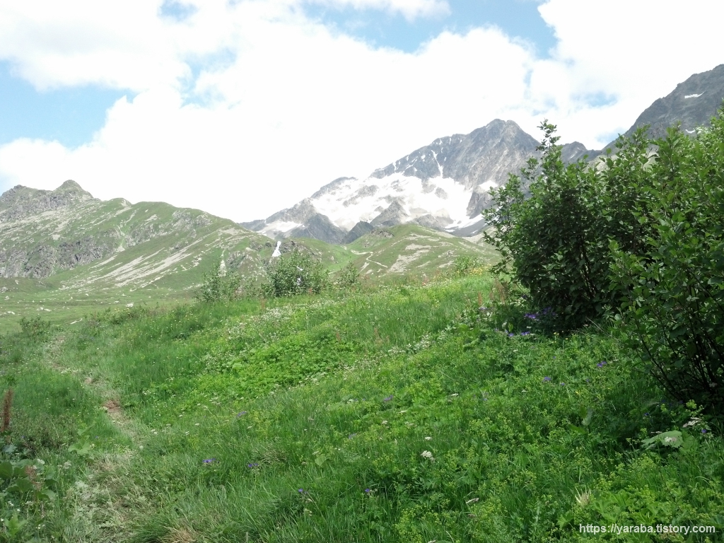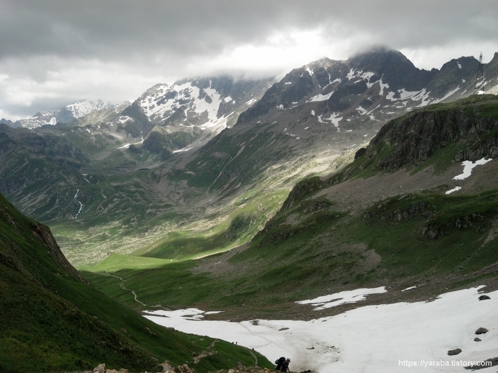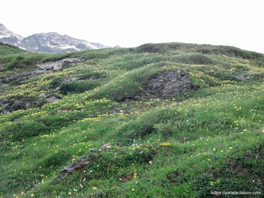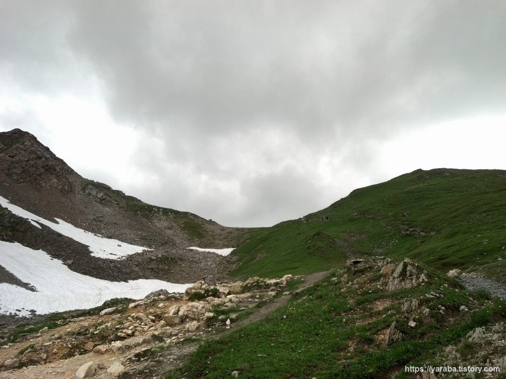 멀리 본옴므 고개가 보입니다. 고개에 가까워질수록 초록빛은 적어지고 회색빛 바위와 자갈, 잔설이 황량함을 더합니다. 더구나 구름이 해를 가리면서 기온이 급격히 떨어졌고 한 여름에 장갑을 착용했음에도 스틱을 잡은 손이 시려서 가끔씩 손을 녹여 주어야 했습니다. 한국에서 짐을 챙기면서 일부러 손가락에 구멍이 있는 장갑을 준비했었는데 이때는 너무 추우니까 그냥 구멍 없는 장갑을 준비할걸! 하고 아쉬워했었습니다.
