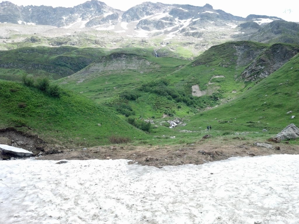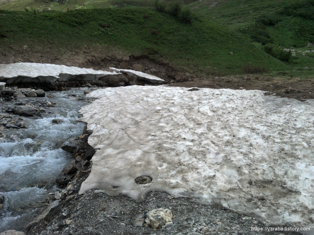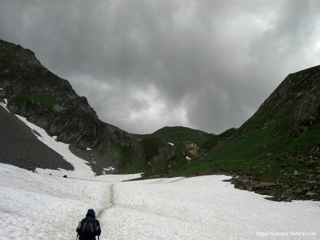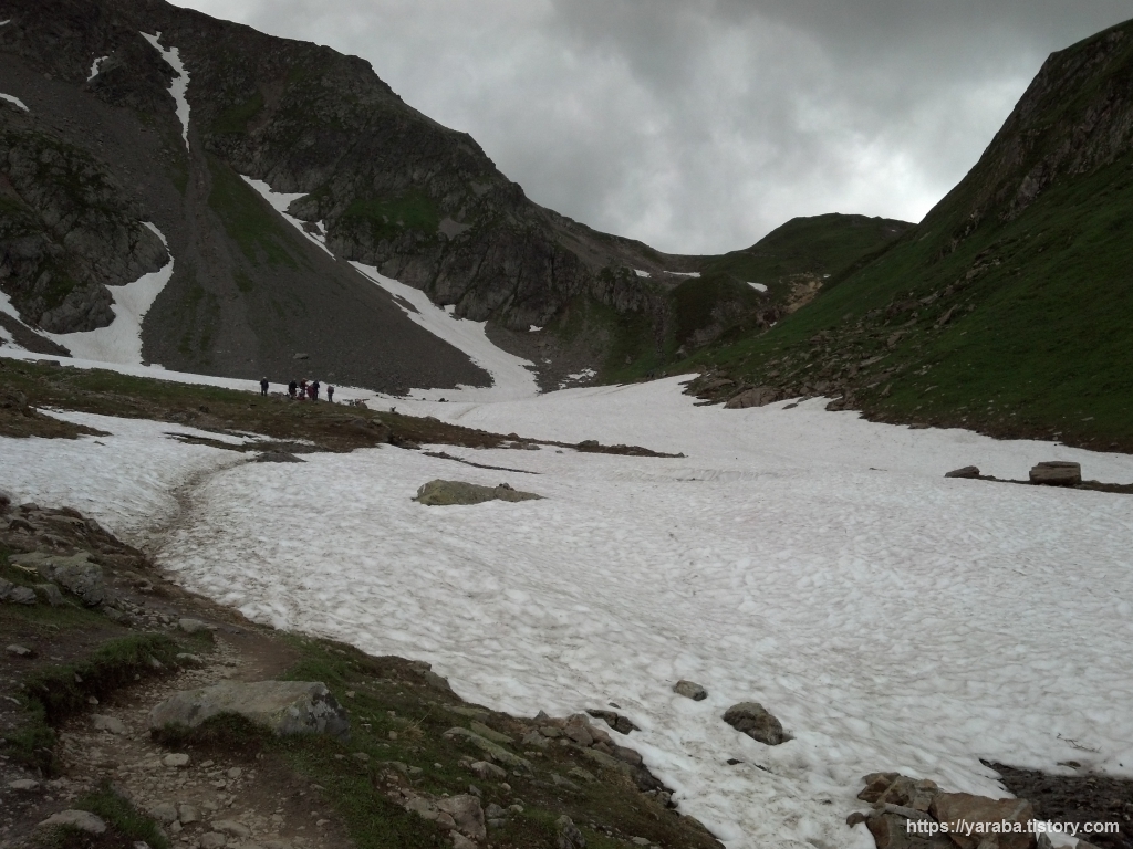 드디어 눈길에 도착했습니다. 아래에서 이 눈길을 바라보며 아이젠도 없는데 저기를 어떻게 가야 하는 염려가 있었었죠. 히마라야 고봉을 정복하는 것도 아닌 평범한 트레킹인데 사진만 보면 지금이 7월 한 여름이라는 것이 실감이 나질 않습니다. 그렇지만, 날씨가 영하로 떨어진 것이 아니고 쌓인 눈도 푹신한 편이어서 아이젠이 없어도 걸을만해서 다행이었습니다. 그래도 눈길의 대부분이 안전했지만 워낙 많이 사람들이 지나간 터라 미끄러운 것은 조심해야 했습니다. 옆지기의 경우 자꾸 미끄러져서 한걸음 한걸음 옮기느라 거북이걸음을 했습니다.