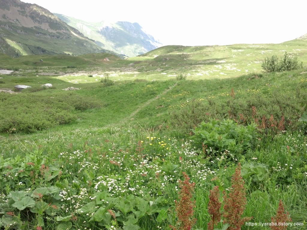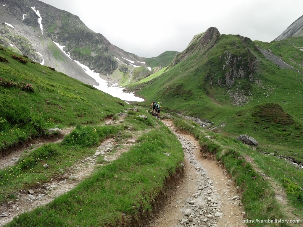 17Km가 넘는 거리를 주파해야 하는 TMB 걷기 2일 차의 마지막 고비입니다. 고도 1,210m의 노트르담 예배당에서 시작한 오르막을 이어가서 2,329m의 본옴므 고개(Col du Bonhomme)에 도착하면 큰 고비는 넘긴 것입니다. 조베 평원에서의 쉼을 뒤로하고 다시 오르막을 오릅니다.