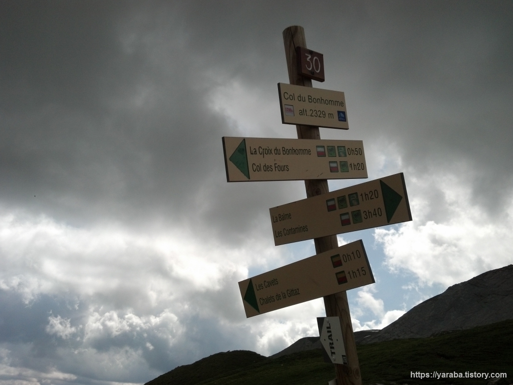 드디어 본옴므 고개(Col du Bonhomme, 2,329m)에 도착했습니다. 다른 고개 같았으면 고갯마루를 정복한 기쁨을 누리며 휴식했겠지만 급격히 떨어진 온도와 강한 바람 때문에 정신이 없었습니다. 다행히 아주 작은 대피소가 있어 잠시 바람을 피할 수 있기는 했습니다. TMB 걷기에서 고개는 어렵게 올라온 오르막을 끝낸 기쁨과 휴식, 그리고 완만한 내리막이 기다리고 있는 장소지만 본옴므 고개는 아닙니다. 본옴므 산장까지 급한 경사는 아니지만 조금 더 오르막을 걸어야 합니다. 본옴므 산장 근처까지 50분이라고 표지판에 적혀 있으니 거의 다 온 것이지만 지쳐버린 몸상태와 강한 바람으로는 두 시간 내에 주파해도 잘한 것이지 않나 싶습니다.