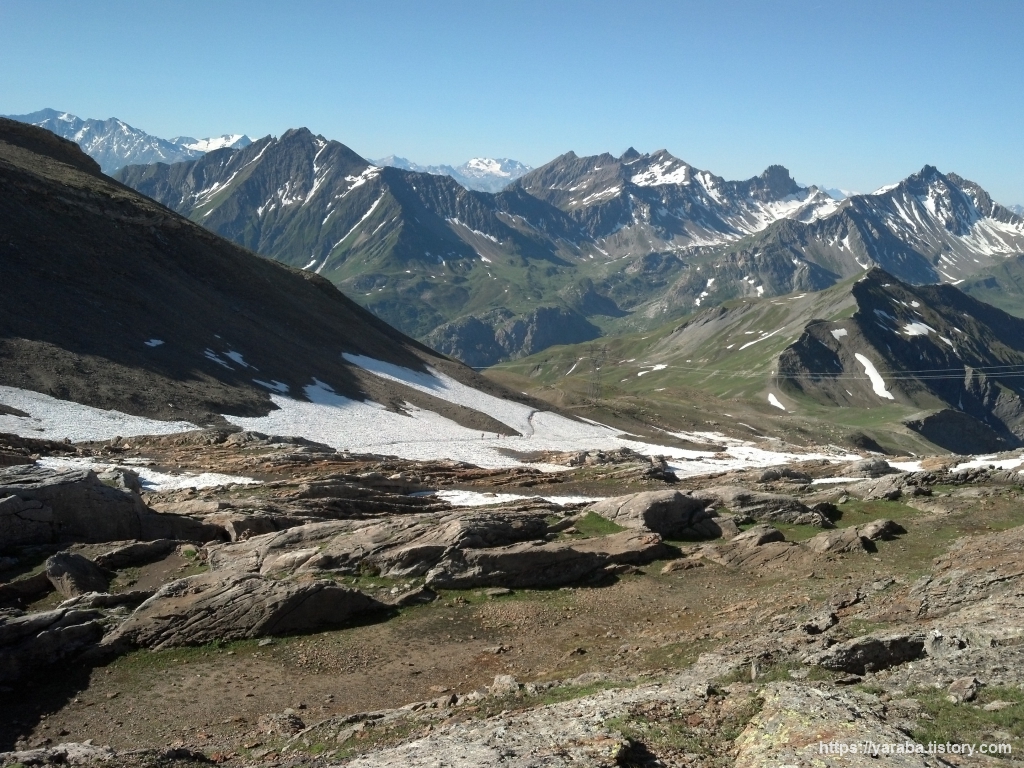 조베 호수를 품고 있는 산의 모습이 절경 그 자체입니다. 조베 호수를 거쳐서 오늘 목적지인 로베르 블랑 산장으로 가는 방법도 있지만 넘어가야 할 고개들을 보니 머리가 절레절레 저어 집니다.