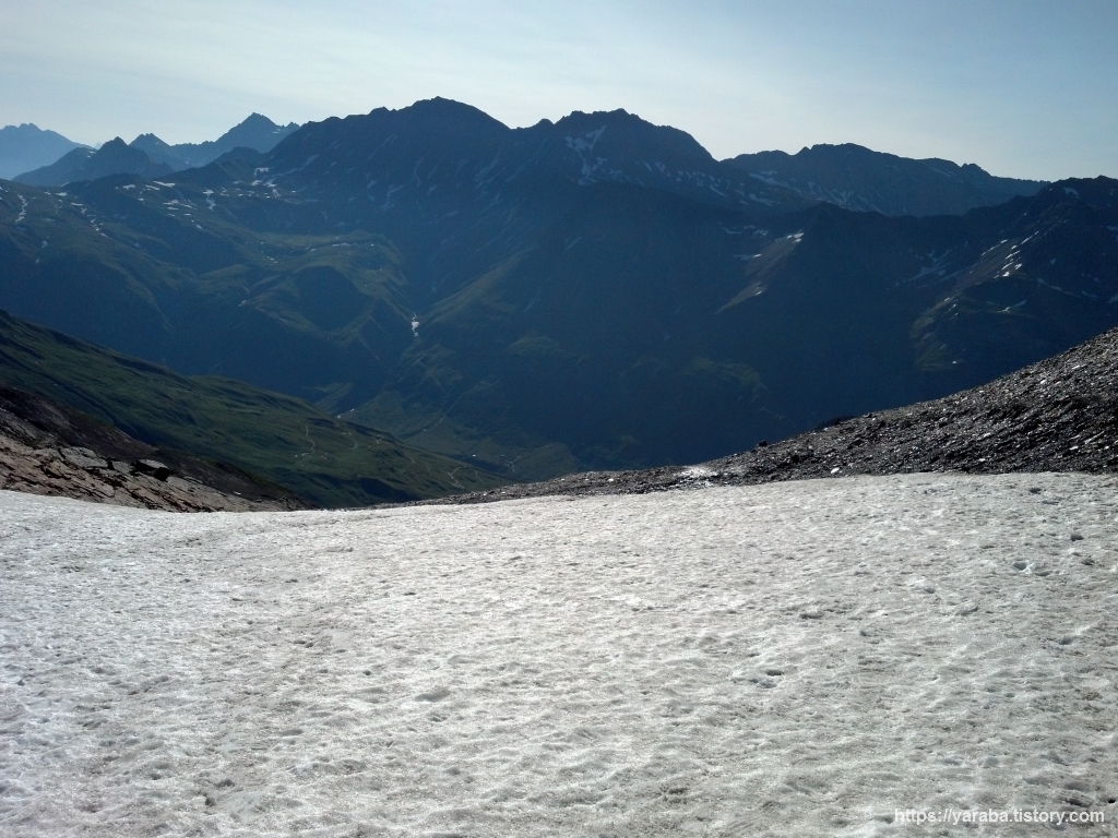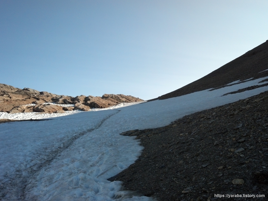 7월의 얼지 않은 눈길이라 다행이기는 하지만 눈길은 역시 속도가 나질 않습니다. 10여분 눈길을 걸어 올라 뒤돌아 본 눈길입니다. 눈길을 걸을 때의 특징은 거의 바로 발 앞만 보고 걸을 밖에 없다는 것입니다. 그렇게 집중해서 걷다 보면 내가 걷는 이 길에 대한 두려움은 어디론가 사라지고 말기는 합니다. 고개를 올려 하늘을 보니 아침 해가 눈 덮인 산을 고문하듯 강렬하게 내리쬐고 있습니다.