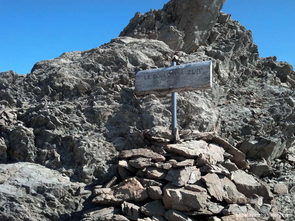 벨라발 계곡에 있는 아주 작은 호수를 지나면 약 백여 미터의 오르막을 완만하게 오릅니다. 이른 시간에 출발했지만 전진 속도는 참으로 더딥니다. 이곳에서 표지판 다운 표지판을 거의 처음 만납니다. 물론 TMB 표식은 없습니다. 오후 3시가 넘어가는 시간인데 2시간 45분이나 남았다고 하니 마음이 급해집니다. 저희는 거의 두배를 계산해야 하니 까마득한 거죠. 실제로 거의 8시가 다 되어서 산장에 도착했습니다. 한 여름에 눈길 걷기는 결코 쉽지 않습니다.