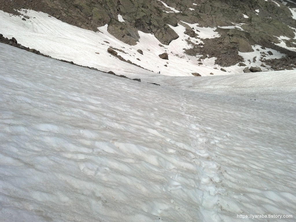 아찔한 눈길을 앞두고 앞서간 사람들의 발자국을 따라서 한 걸음씩 옮기지만 쉽지만은 않습니다. 스틱을 잡고 한 걸음씩 옮기는데 뒤에서 옆지기는 엉덩 방아를 찧으며 힘들어합니다. 스키어들에게는 몇 초도 걸리지 않을 길이지만 아이젠도 없는 저희는 그저 등산화를 쾅쾅 세게 밟아 미끄러짐을 최소화하고 스틱을 적절하게 사용하는 방법밖에 없습니다. 다행히 눈이 푹푹 들어가는 구간이 거의 없어서 다행이기는 했습니다.