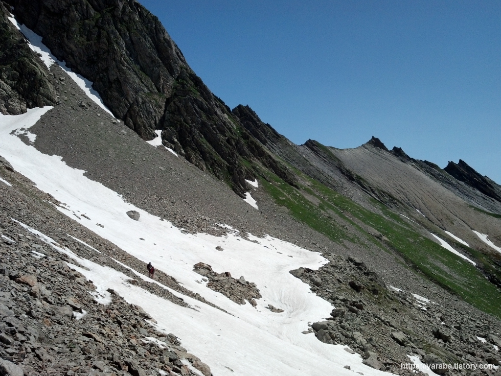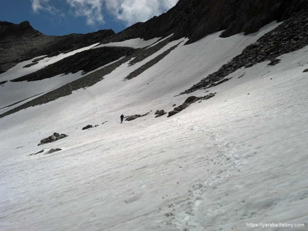 멀리 아주 작은 호수가 있는 옆쪽으로 지나가야 합니다. 눈길을 한참 통과해야 합니다. 조베 호수 쪽에서 넘어오는 길도 연못 근처를 통과해서 아래로 내려가는데 저 지점에서 하산하면 모테 산장으로 갈 수 있습니다. 저희 앞쪽에서 가던 사람들은 대부분 모테 산장 쪽으로 내려가더군요. 결국 그 이후는 오로지 저희 힘으로 길을 찾아야 했습니다.