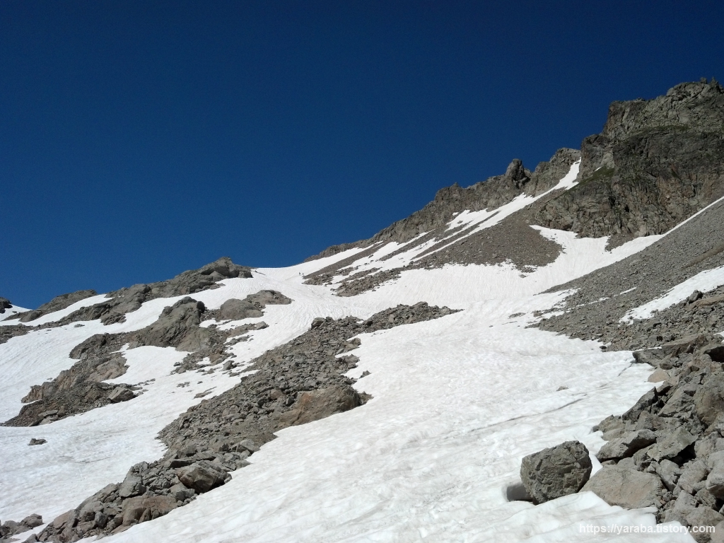 한 여름에 눈길 걷기가 처음에는 신기해서 인증숏을 남기느라 여념이 없고 기분 좋은 경험으로 남을 것만 같았습니다. 그러나, 계속해서 만나는 눈길은 고난의 행로 그 자체였습니다. 저의 경우에는 눈 비탈에서 녹고 있던 눈에 미끄러지면서 얼마간을 굴렀습니다. 비탈에서 배낭을 멘 채로 굴러 떨어지는데 스틱을 찍어도 멈추지가 않았습니다. 이렇게 가는 구나하는 마음이 스쳐 지나갔습니다. 이렇게 포기하면 안 되지 하면서 스틱을 다시 힘차게 찍었는데 그제야 겨우 멈출 수 있었습니다. 당시에 반바지를 입고 있었는데 무릎이 긁히고, 왼쪽 손등이 얇게 찢어지는 가벼운 부상을 입었습니다. 갈길이 먼데 그 정도였던 것이 정말 다행이었습니다. 스틱은 굽어져서 지금도 그 흔적이 그대로 남아 있습니다. 그다음부터는 더욱 조심하게 걸을 수밖에 없었습니다.