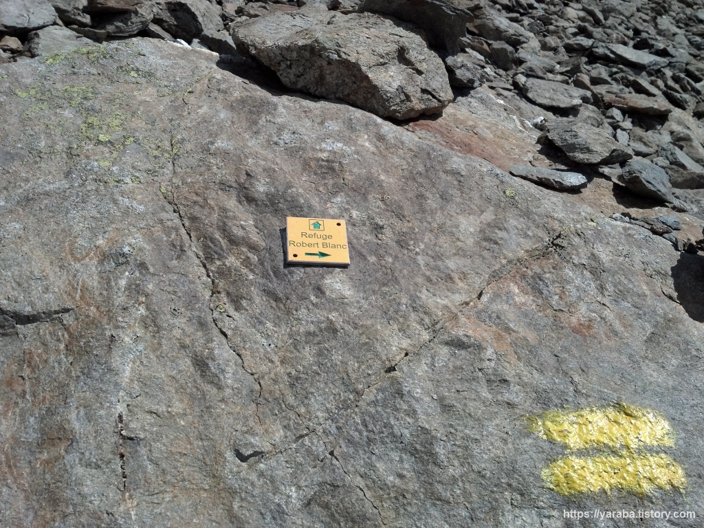 드디어 처음 만난 로베르 블랑 산장의 표식입니다. TMB 마크는 전혀 존재하지 않습니다. 오로지 두 줄짜리 노란색 페인트 표시가 경로임을 나타내 줍니다. 두 줄 노란색 표시를 바위나 조금 큰 돌에 표시해 놓았기 때문에 길이 분간되지 않는 경우에는 이런 표식을 잘 찾아야 합니다.