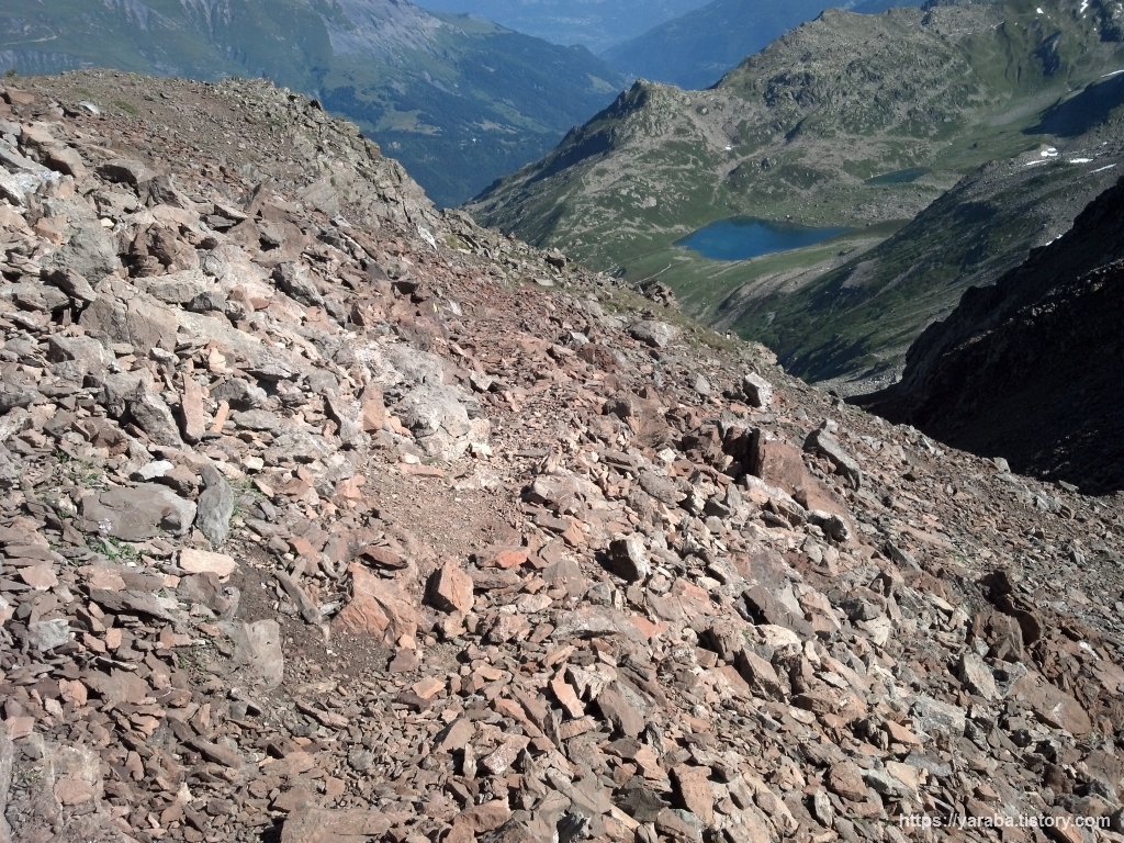 벨라발 봉우리(Têtes des Bellaval)에서 이어지는 산등성이를 넘을 때 바라본 내리막 길입니다. 아무리 경사가 급한 길이라도 이 악물고 한 발짝씩 이동하면 통과할 수는 있는데 산 넘어 산이라고 한 고비를 넘어서면 또다시 다가오는 아찔함은 그냥 어이가 없게 만듭니다. 고개를 힘들지만 잘 올라왔다 안도하는 순간 다가오는 아찔한 지그재그 내리막입니다. 돌이 부서진 흙으로 이루어진 이런 길이 이쪽 경로에서는 심심치 않게 나타나는데 미끄러지지 않도록 주의해야 합니다.