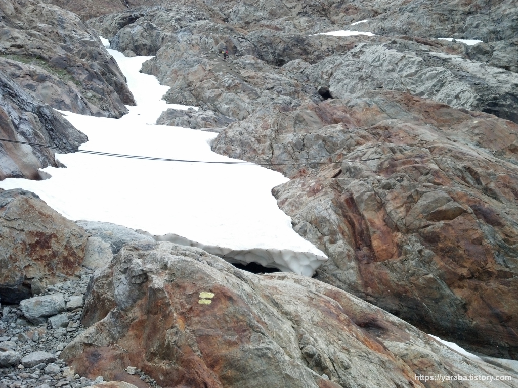 저희 앞에서 길잡이처럼 앞서 가시던 팀도 시야에서 사라진 지 오래고 노란색 두 줄짜리 표식을 따라서 글레이셔 빙하 하단 지역을 통과하는데 폭포 앞에서 표식을 더 이상 찾을 수 없었습니다. 고개를 들어 등산로 흔적을 찾아보니 폭포 건너편으로 바위에 표시된 두 줄짜리 표식과 망가진 출렁다리만 있을 뿐이었습니다. 아마도 눈사태로 다리가 완전히 망가진 모양이었습니다.