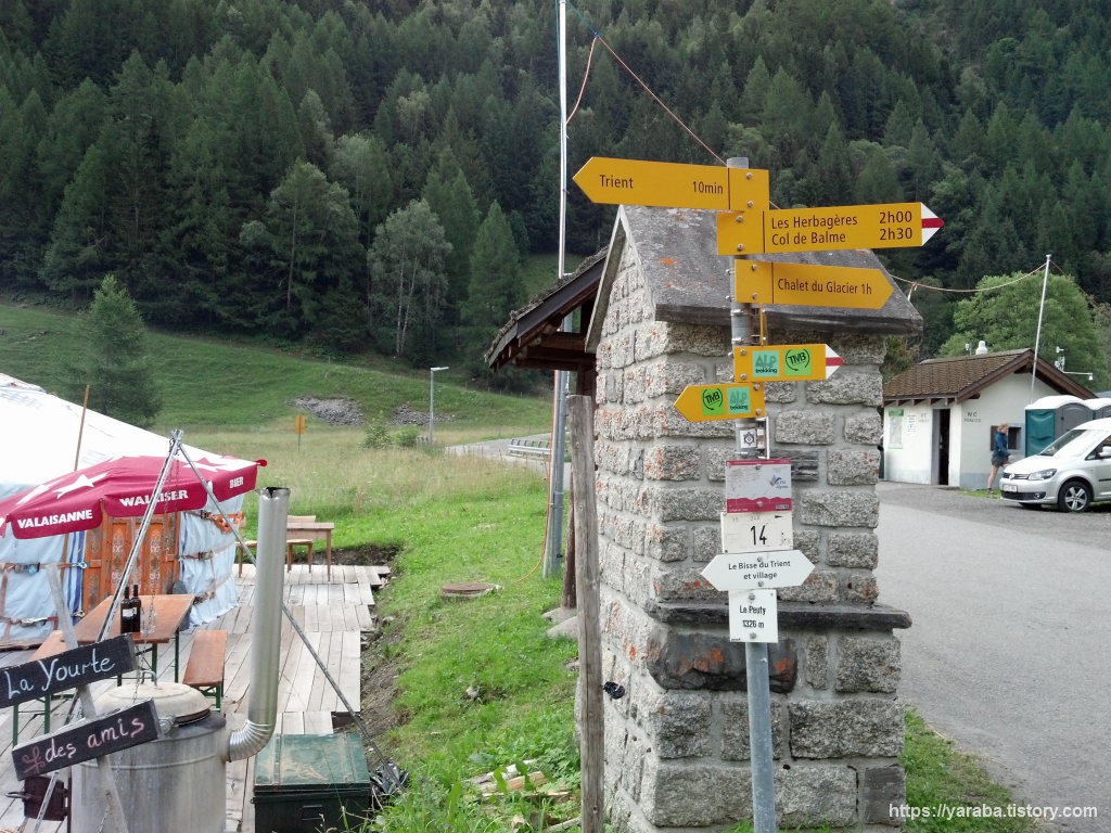발므 고개(Col de Balme)로 가는 다른 경로가 있지만 저희는 "TMB" 마크가 새겨진 르 푸티(Le Peuty) 방향을 향해서 걷습니다.