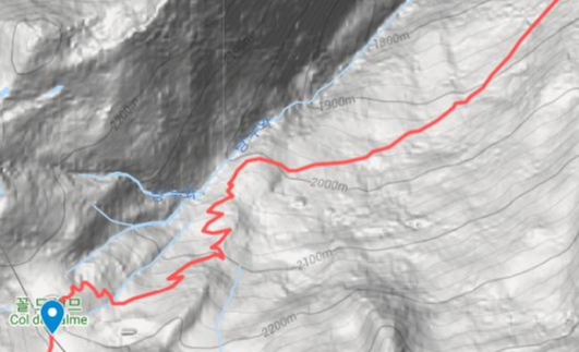 지그재그 길로 한 시간 가량 경사길을 오르고 나면 이제 숲길을 벗어나 멀리 트리앙 계곡을 뒤로하고 우측으로는 철십자봉(Croix de Fer, 2,343m) 자락을 바라보면서 산허리를 걷게 됩니다.