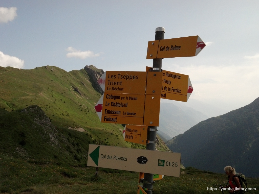드디어 발므 고개(Col de Balme, 2,191m) 표지판이 나왔습니다. 철십자봉을 비롯해서 다양한 곳으로 가는 표식이 있지만 TMB 표식을 따라서 발므 고개로 갑니다.
